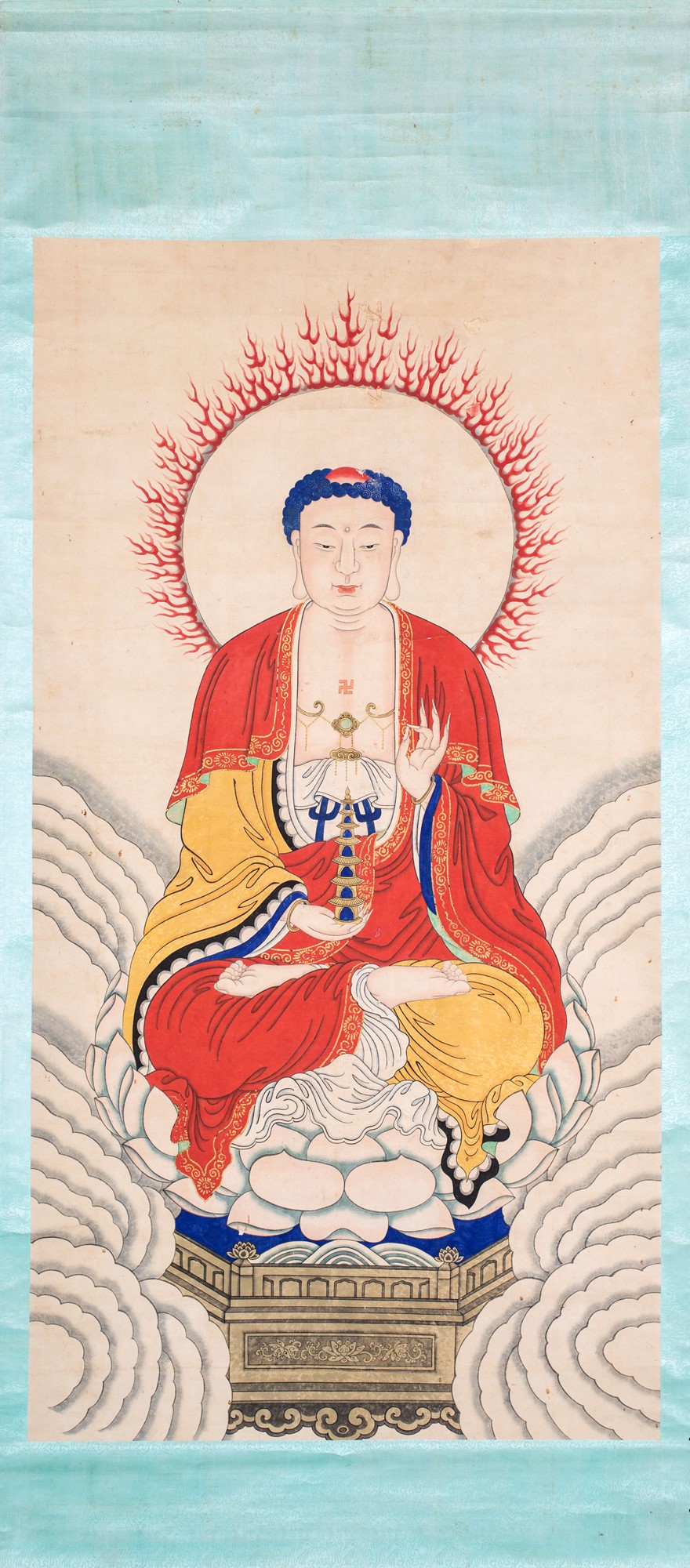 Grande rotolo verticale, Cina, XX secolo raffigurante Buddha in Abhayamudra...