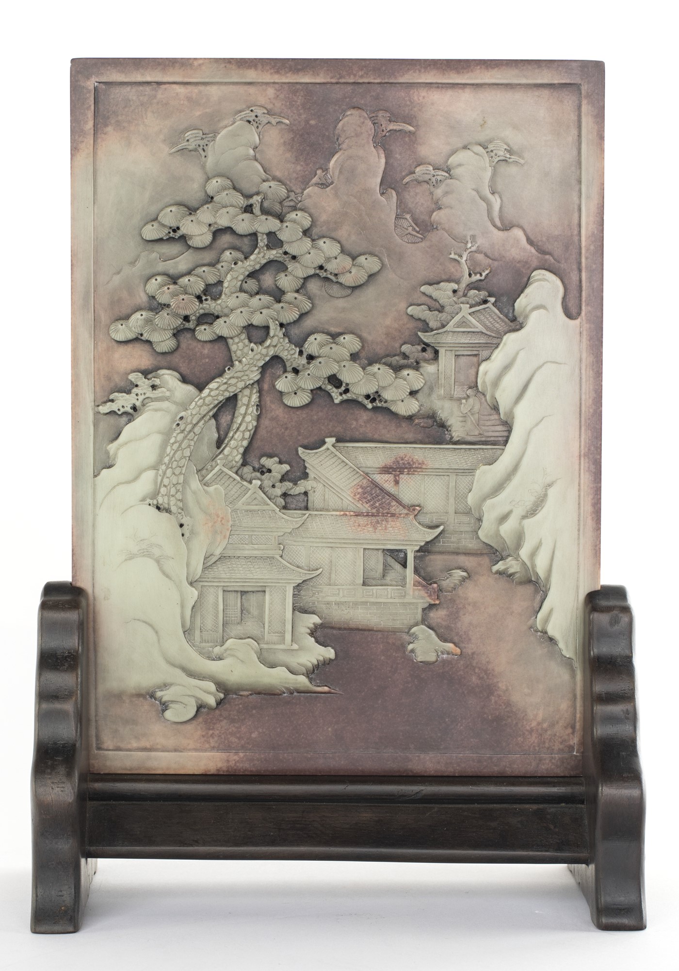 Schermo da tavolo in pietra saponaria, Cina, fine della dinastia Qing, inizi del XX secolo con un paesaggio tradizionale con architetture a cameo; supporto in legno, cm 27x20