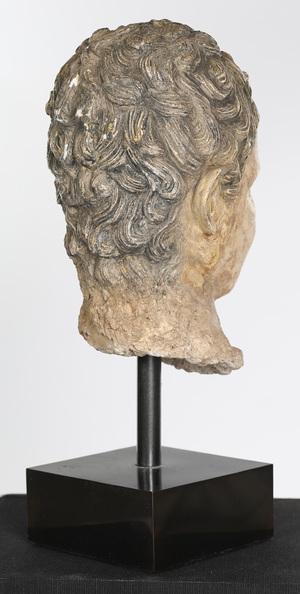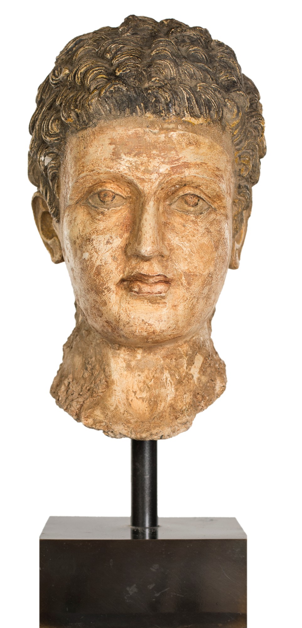 Testa di giovane in stucco policromo, area storica del Gandhara, II-III secolo Splendido esempio di contaminazione greco-indiana che ha connotato la civiltà del Gandhara rendendo la sua arte unica nel panorama storico del mondo antico. Accompagnato da attestato di libera esportazione, cm 30x17