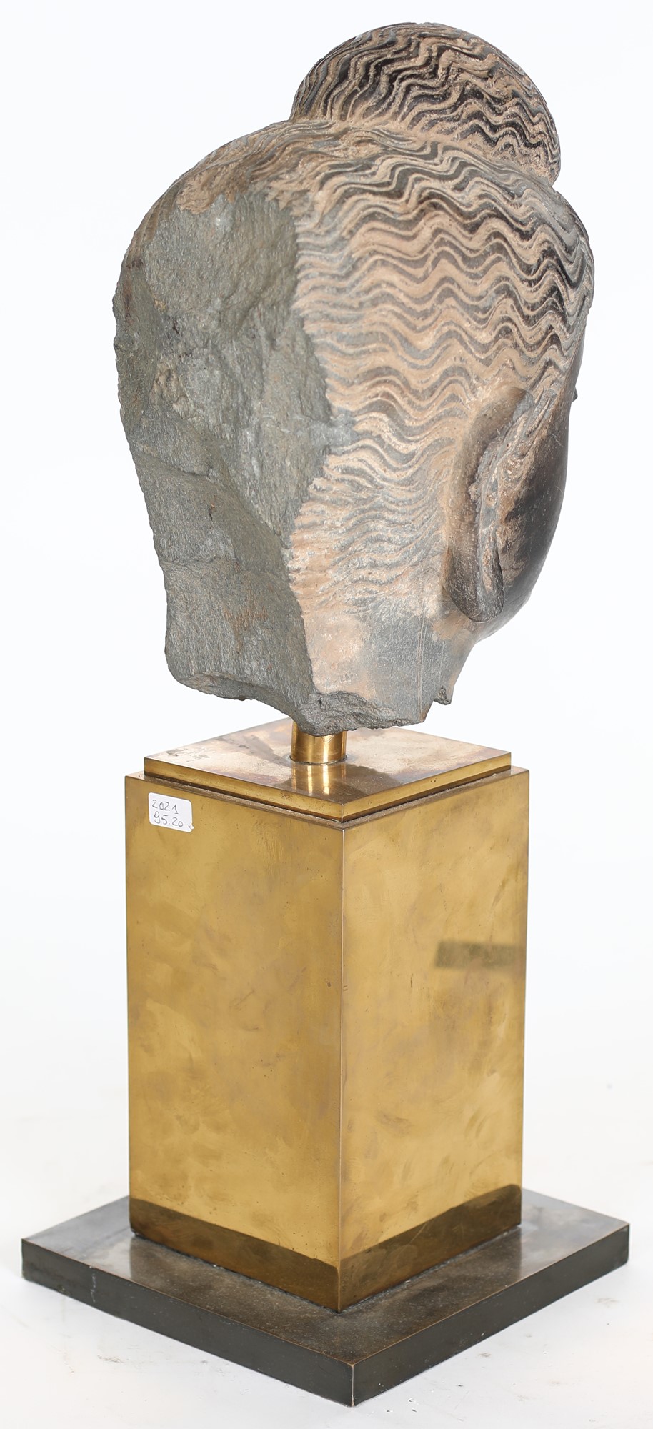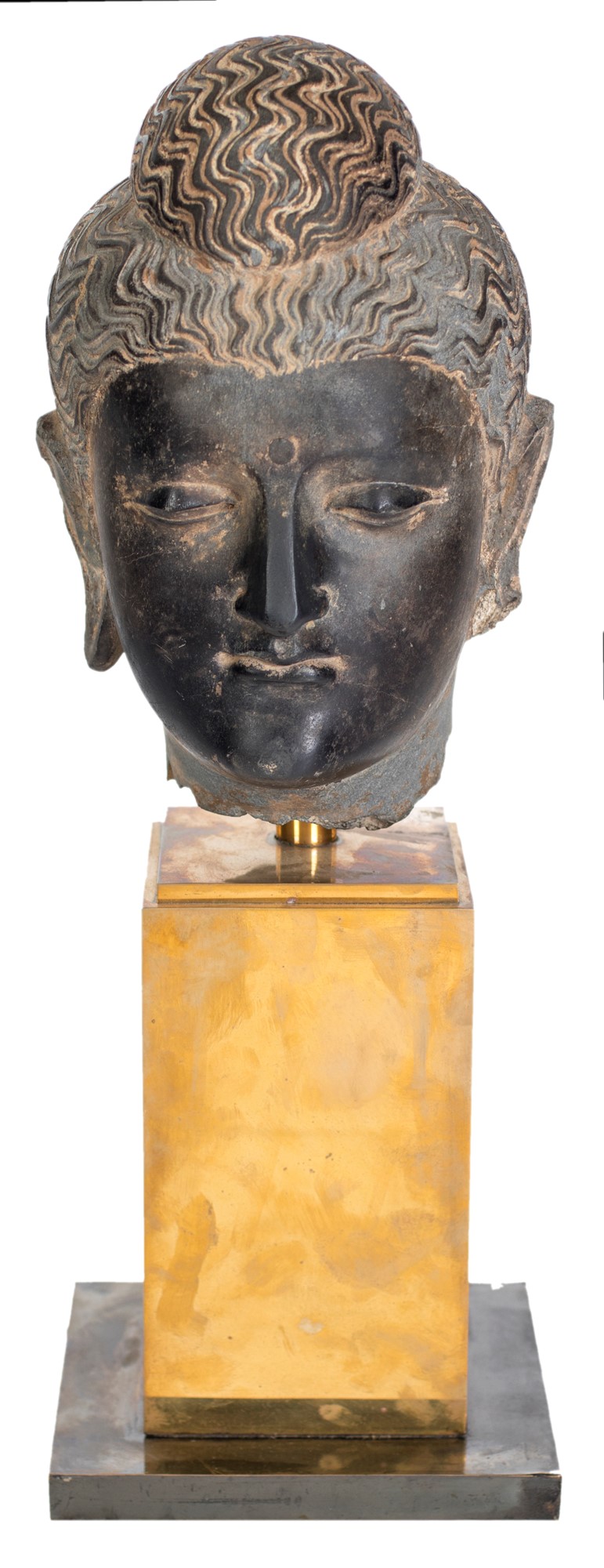 Testa di Buddha in scisto nero, area storica del Gandhara, III-IV secolo volto assorto in meditazione con capelli ondulati e voluminosi raccolti sulla sommità della testa a formare l'ushnisha. Le prime raffigurazioni dell'ushnisha nell'iconografia del periodo Gandhara erano probabilmente intese a simboleggiare una corona. Piccolo restauro al naso. Provvisto di attestato di libera circolazione, cm 30x23