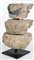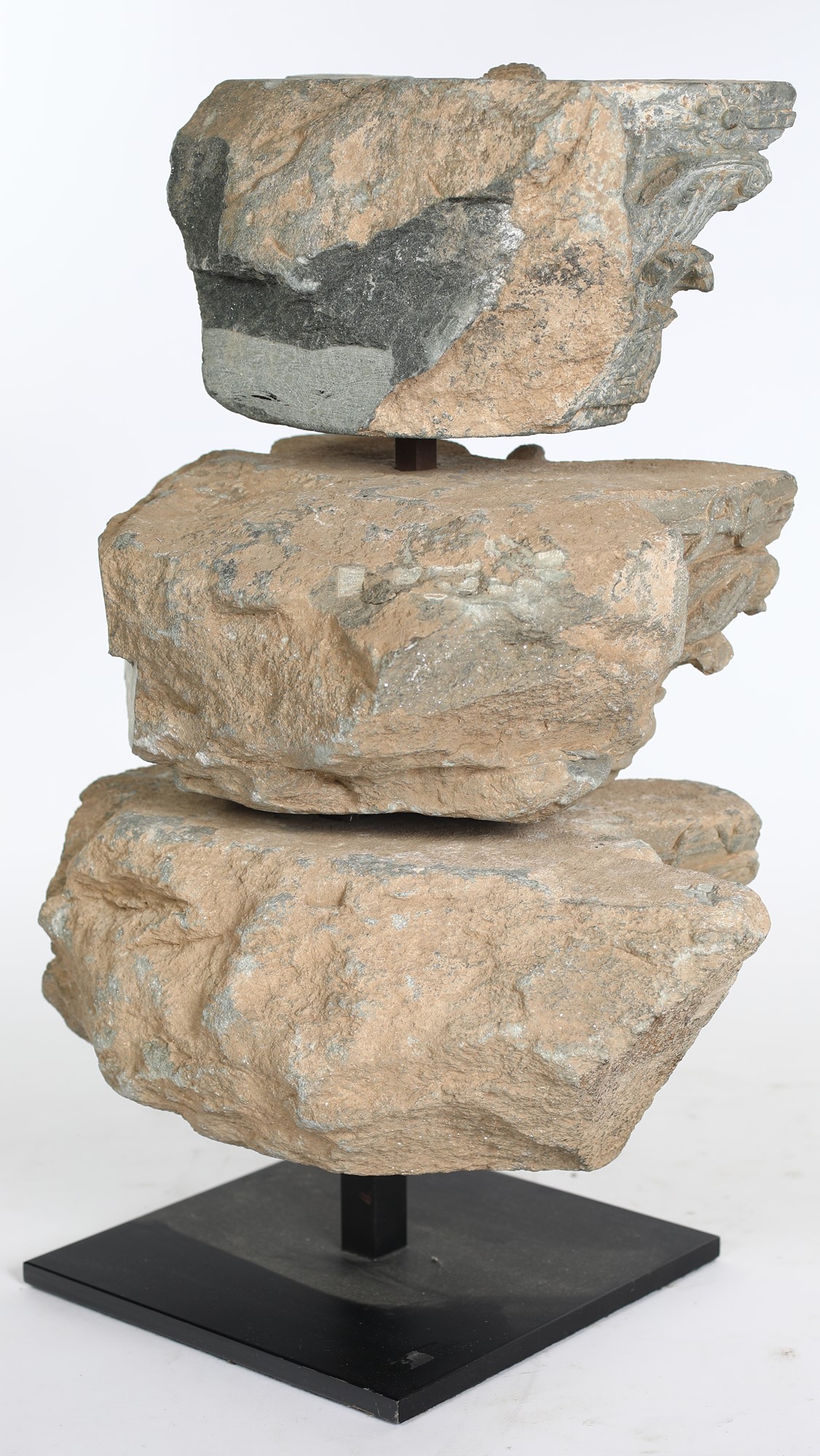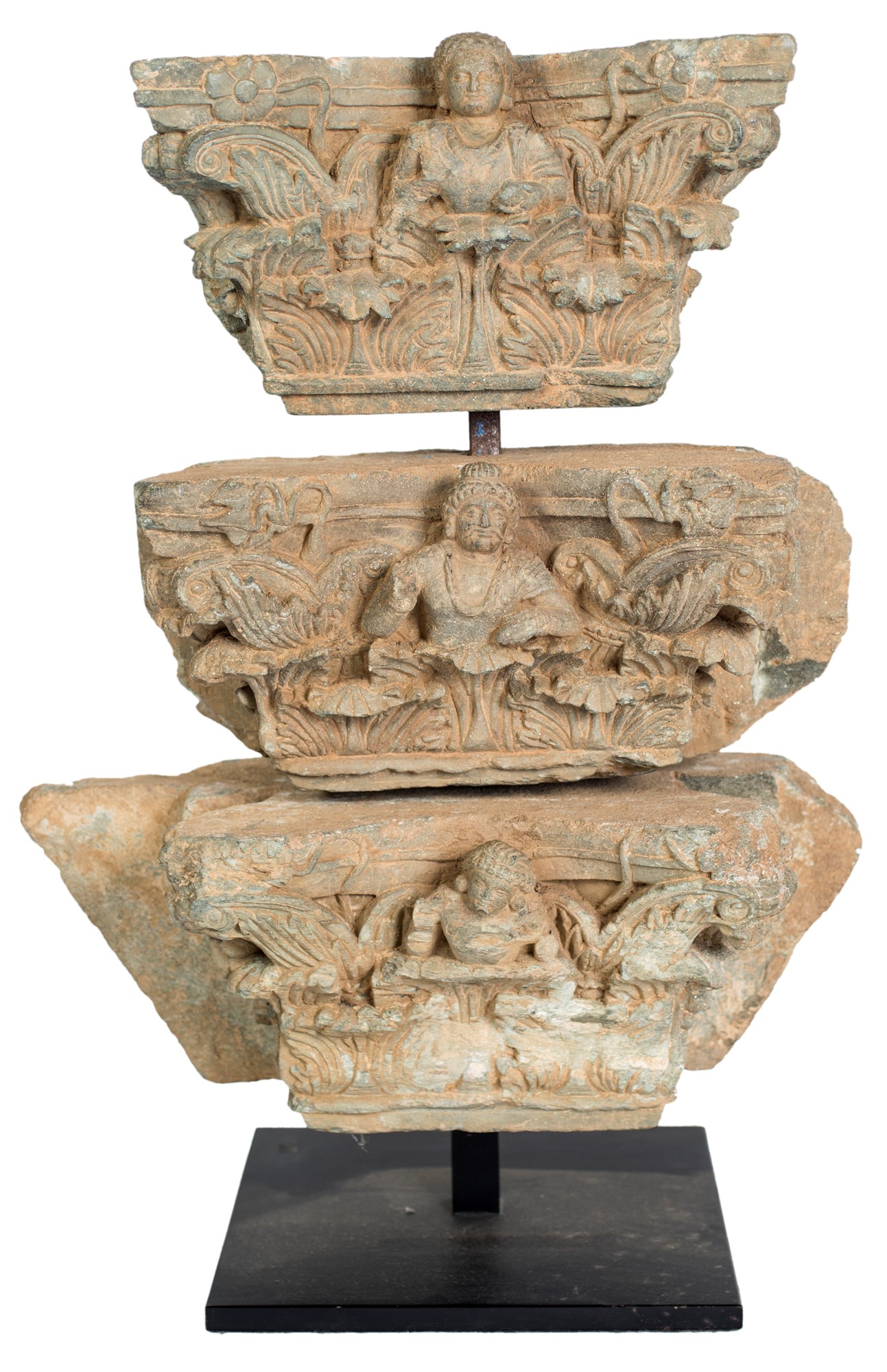 Tre capitelli in scisto grigio, area storica del Gandhara, II-III secolo ognuno centrato da un busto di Buddha o di un Bodhisattva emergente da volute di gusto pseudo corinzio. Ogni elemento è accompagnato da attestato di libera circolazione, cm 17x29 - cm 17x35 e cm 17x44