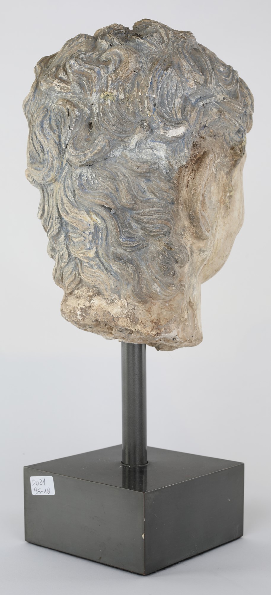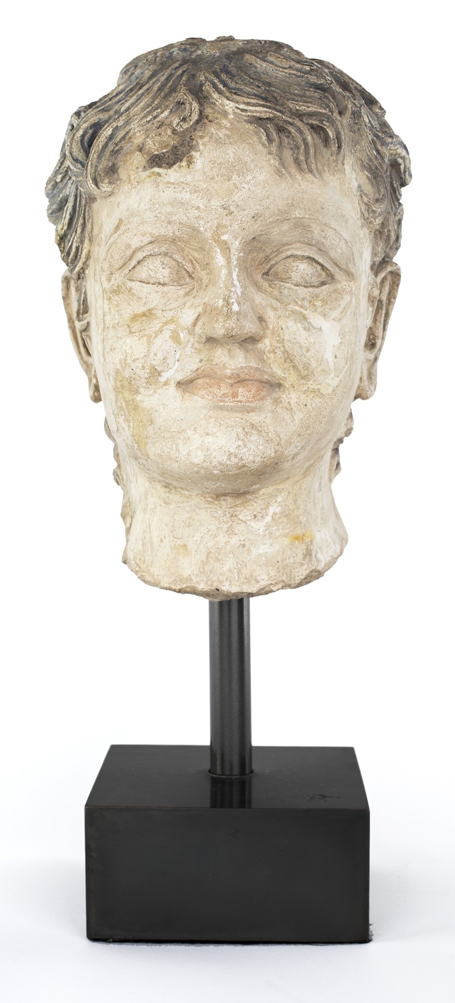 Testa di giovane in stucco policromo, area storica del Gandhara, III-IV secolo Splendido esempio di contaminazione greco-indiana che ha caratterizzato la civiltà del Gandhara, rendendo la sua arte unica nel panorama storico del mondo antico. Corredato di attestato di libera circolazione, cm 30x17