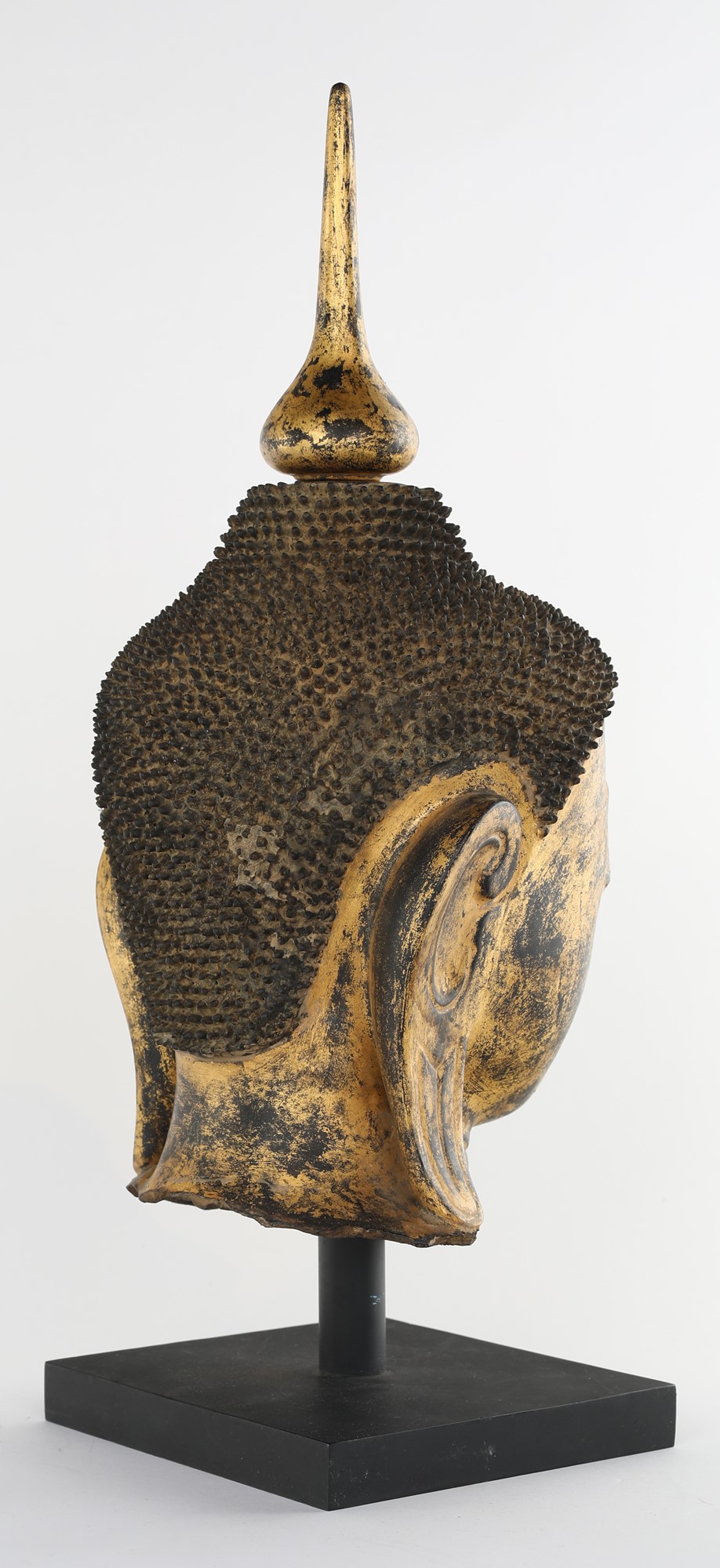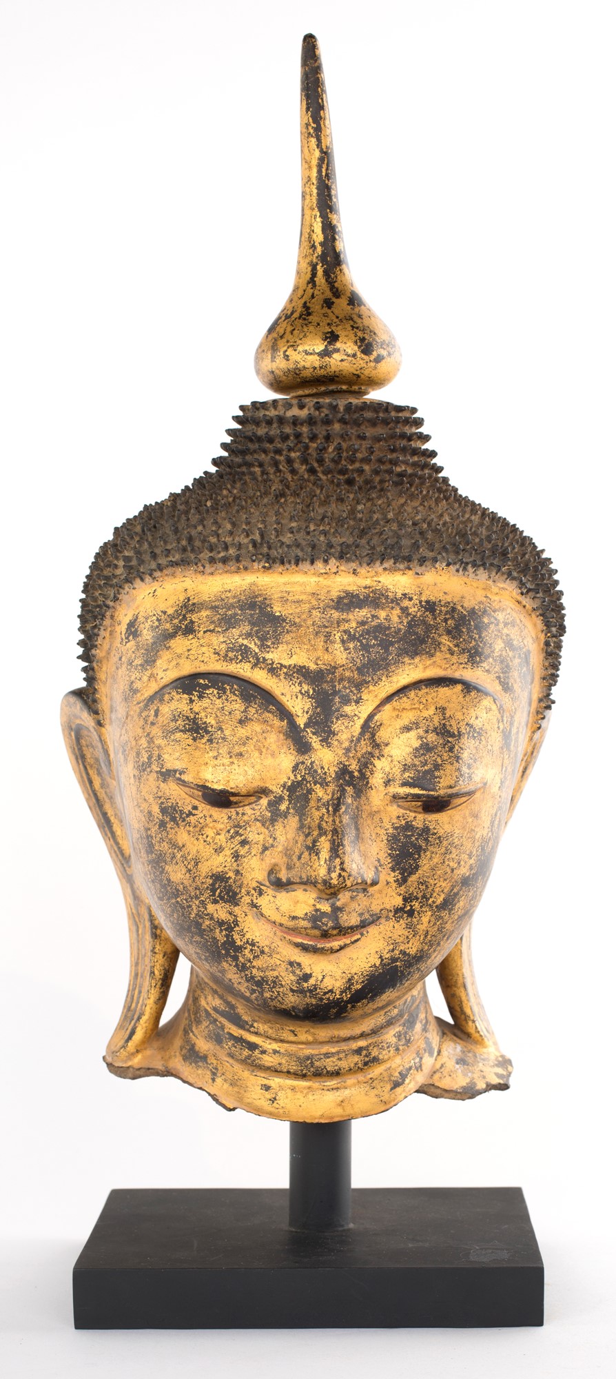 Testa di Buddha in lacca e carta pesta su stoffa, Birmania, XIX secolo eseguita in stile Tai Yai-Mandalay. La tecnica di esecuzione era molto complessa: su un modello di argilla si applicava la stoffa mista a lacca; in seguito (circa una quindicina di giorni), quando la lacca si era completamente asciugata, l'argilla veniva eliminata dall'interno, 37x14
