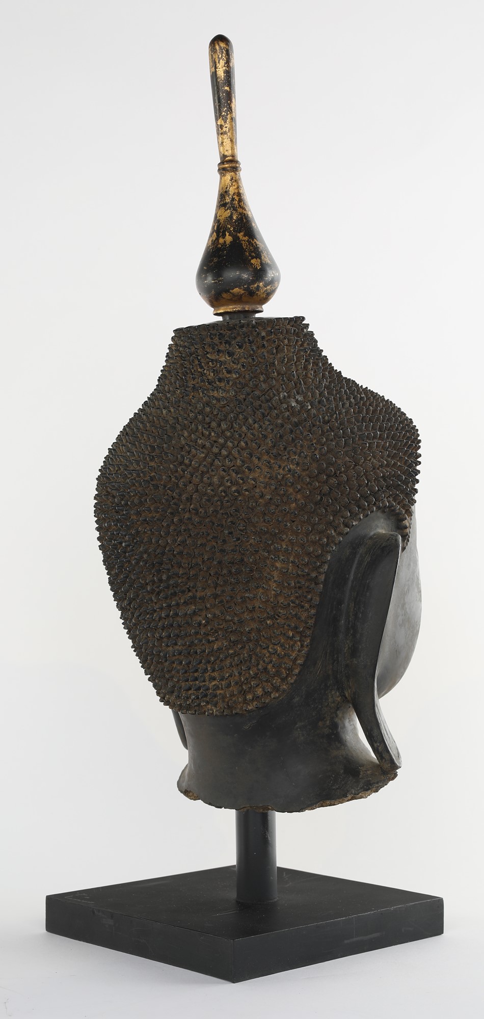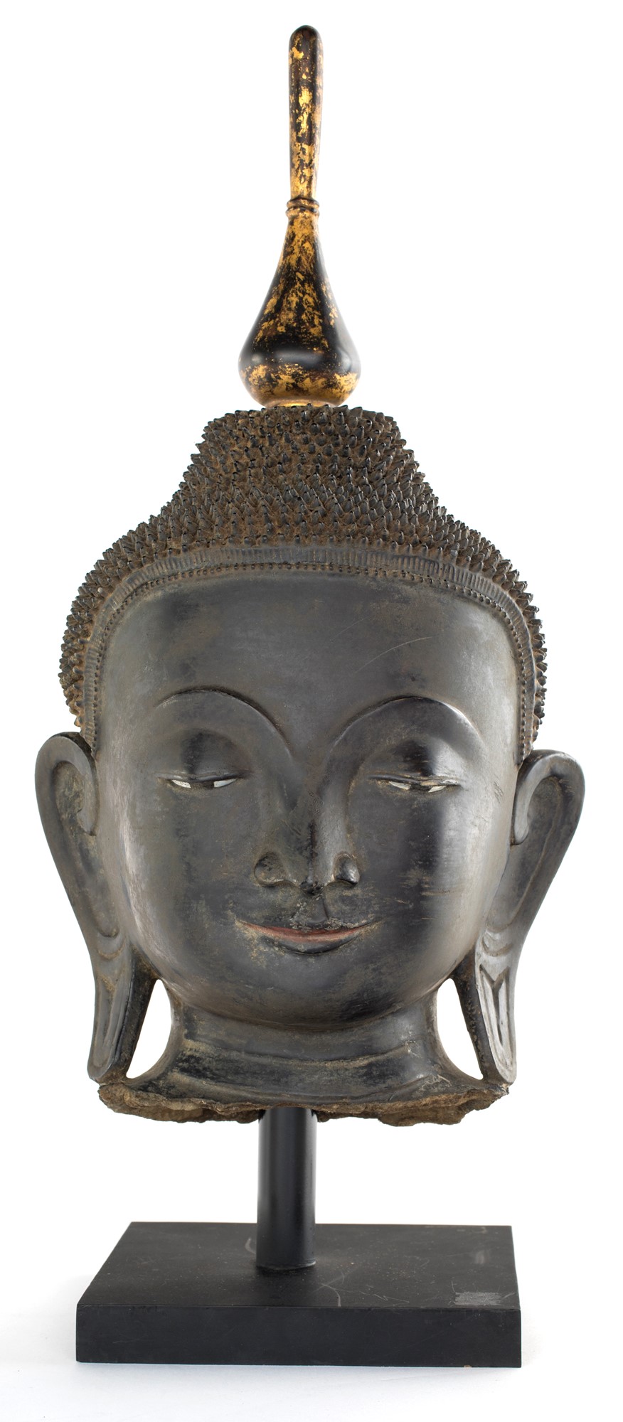 Testa di Buddha in lacca nera e carta pesta su stoffa, Birmania, XIX secolo Tracce di doratura, 38x17