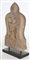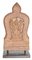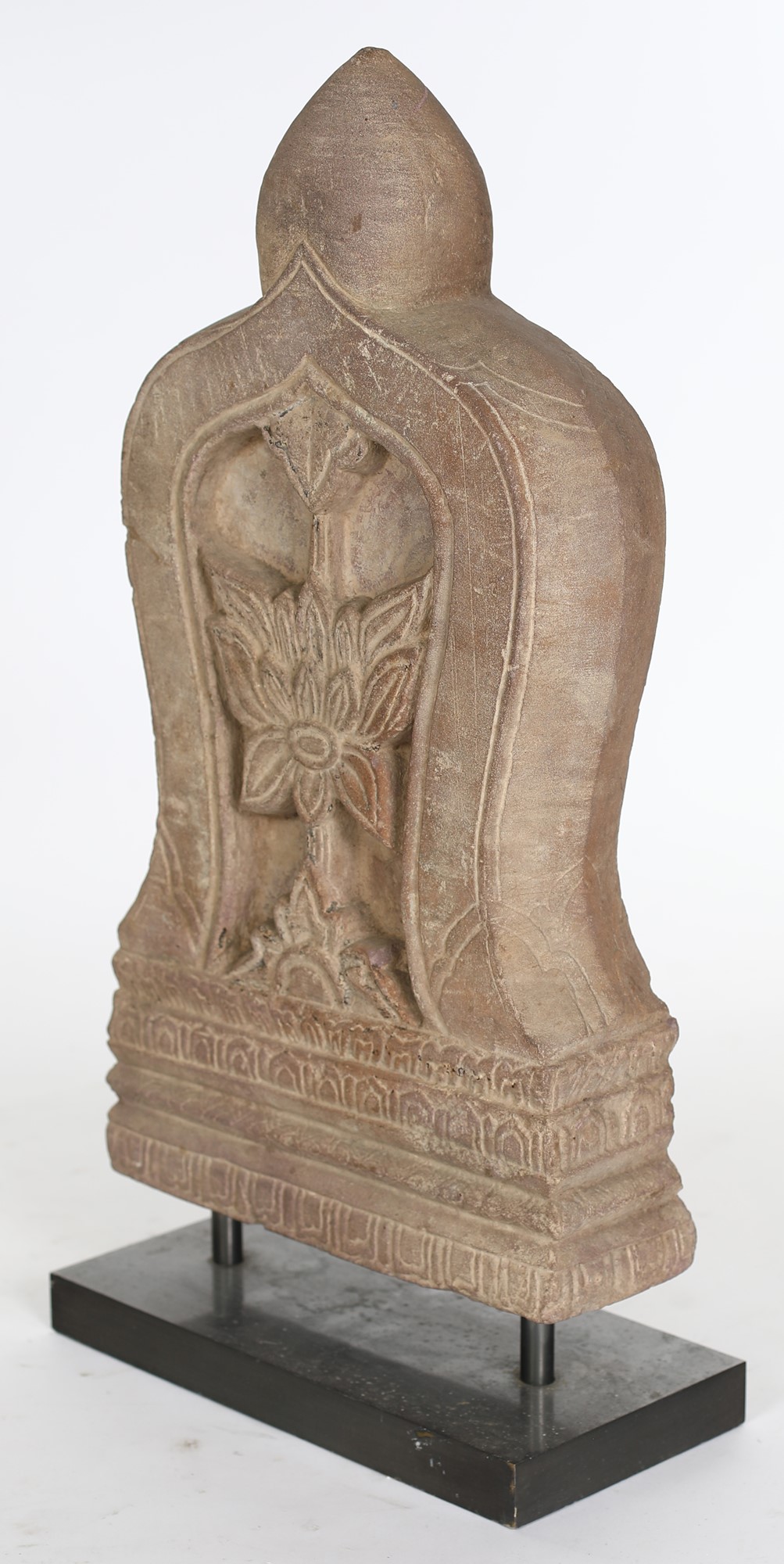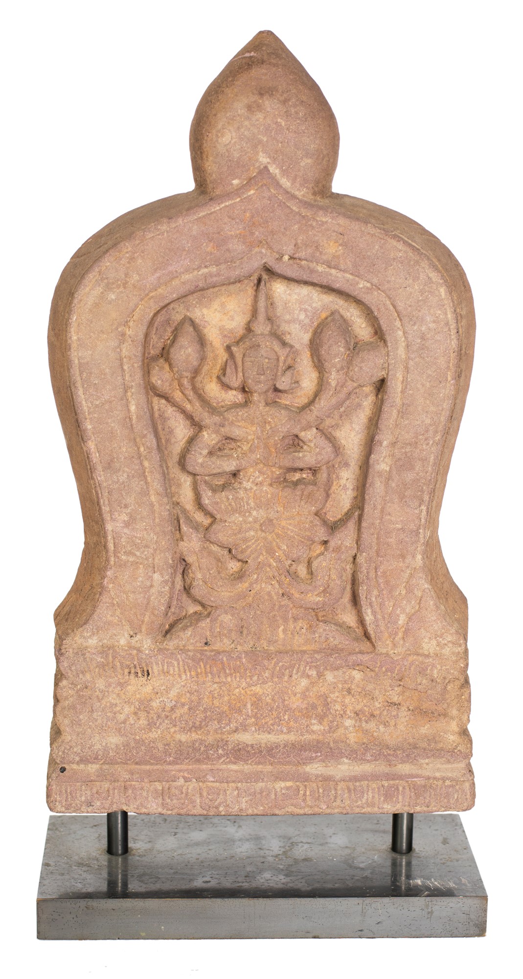 Edicola in pietra arenaria rosa con tracce di doratura, Birmania, XIX secolo centrata da figura in bassorilievo di Buddha seduto in trono con due fiori di loto nelle mani; al verso decoro floreale, 55x31