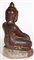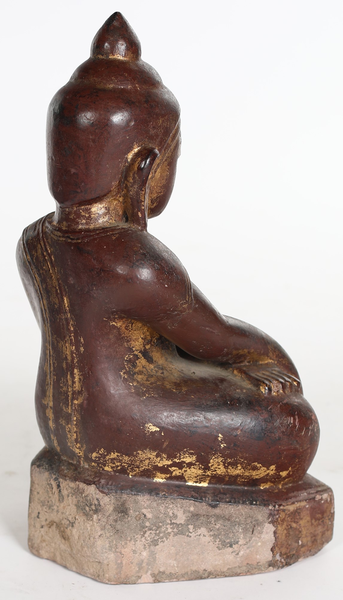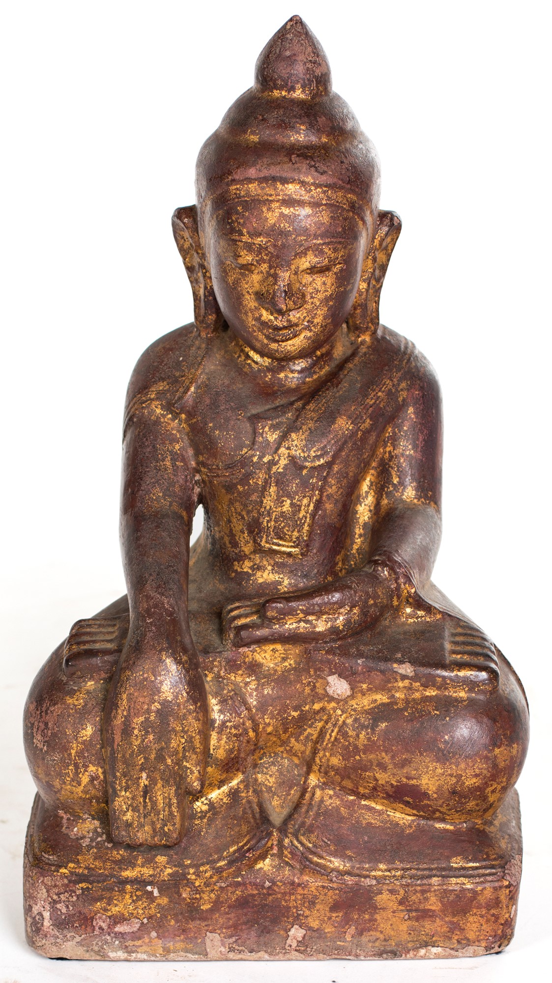 Buddha Bhumisparsha in pietra arenaria laccata in rosso e dorata, Birmania, XIX secolo, 42x23