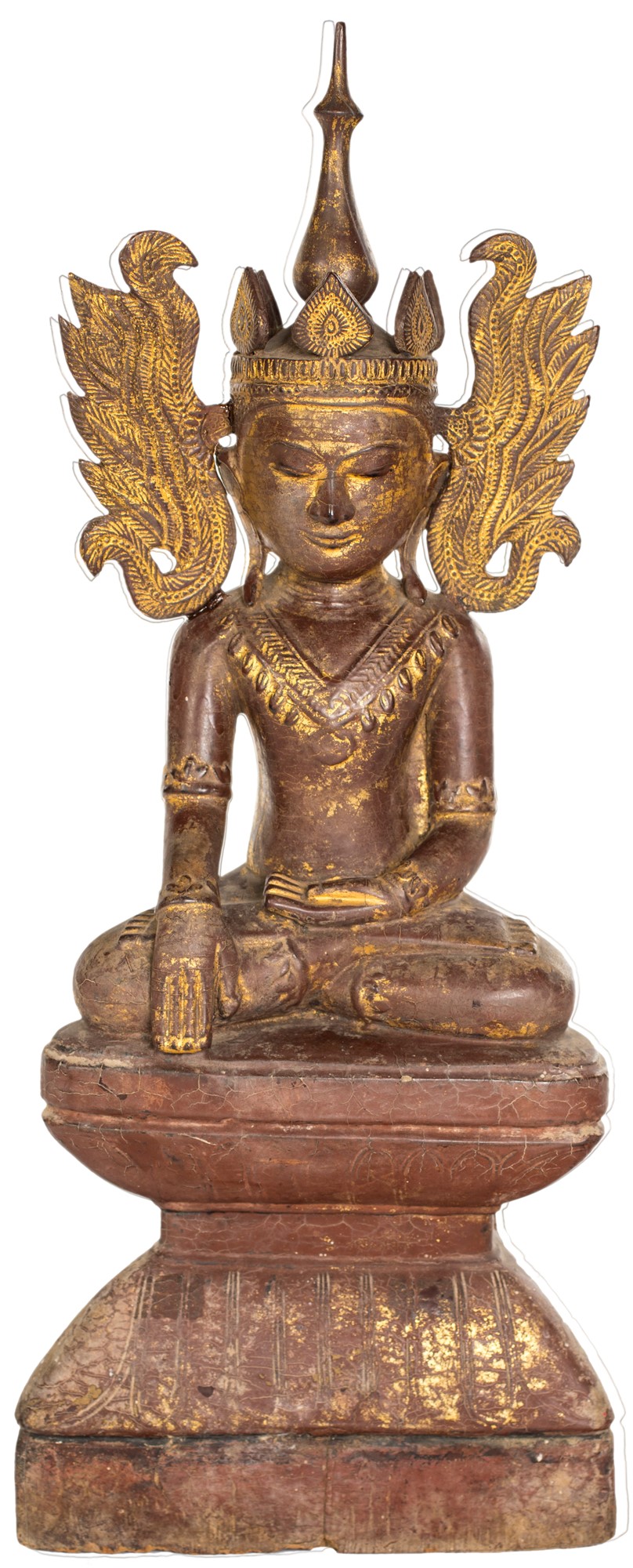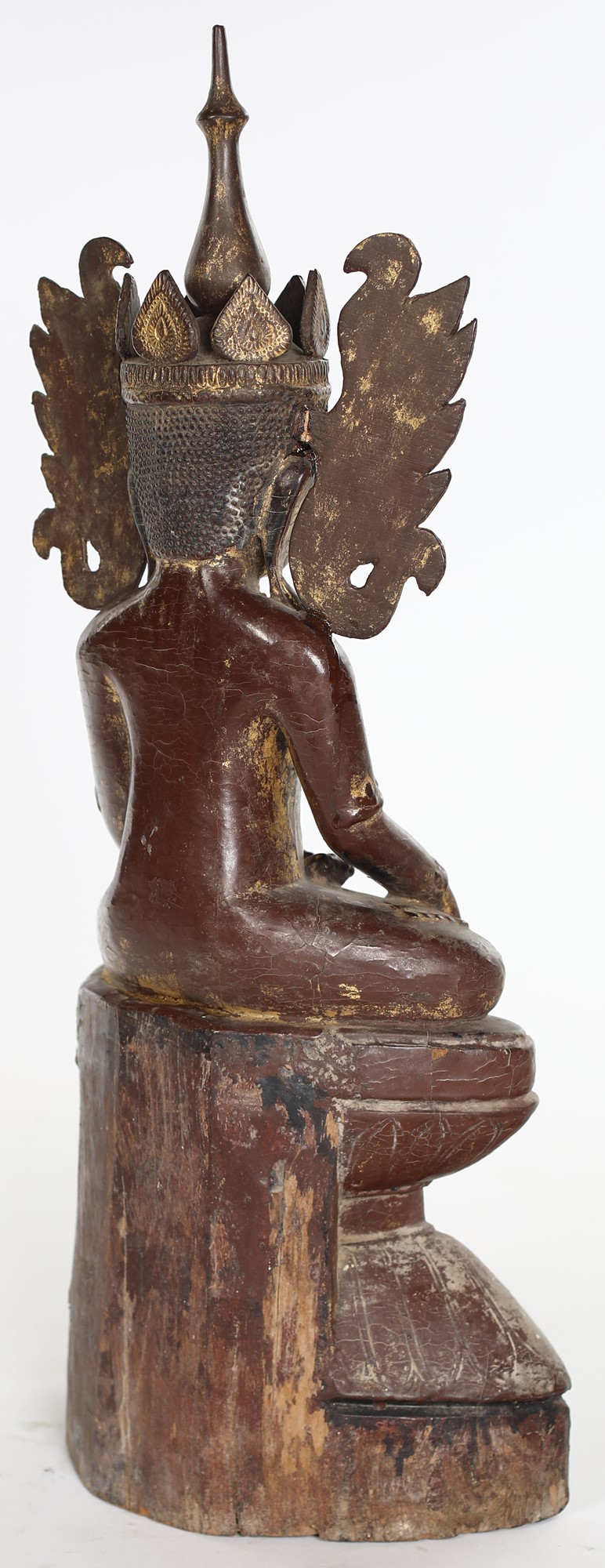 Buddha Bhumisparsha in legno laccato rosso con tracce di doratura, Birmania, XIX secolo seduto in trono su base a fior di loto, realizzato in stile post Pagan di Ava, antica capitale oggi chiamata Innwa, 63x25