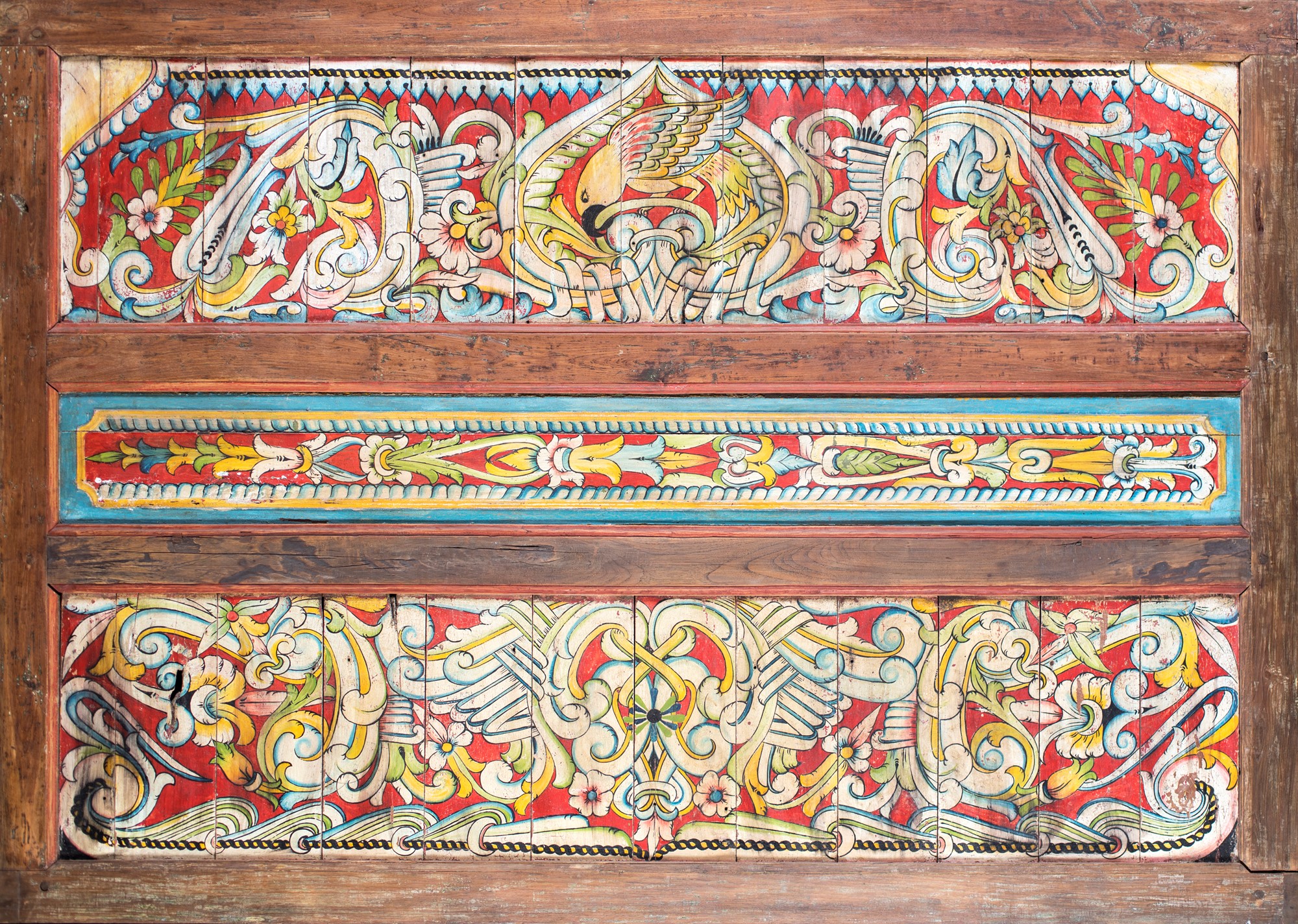 Grande pannello in legno policromo, Bali, Indonesia, XIX secolo con fitta decorazione a motivi naturalistici su fondo rosso; al centro un pappagallo, 148x208
