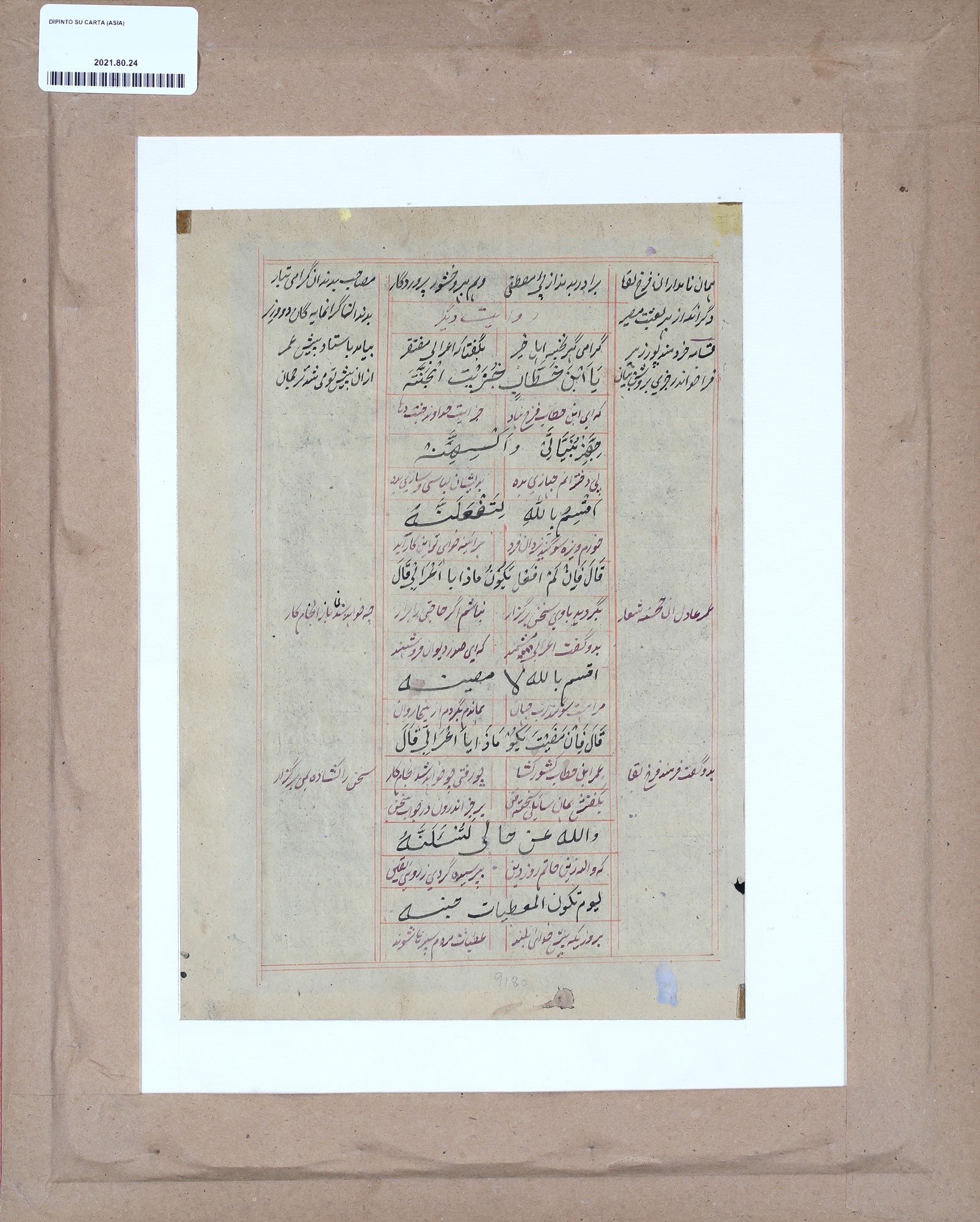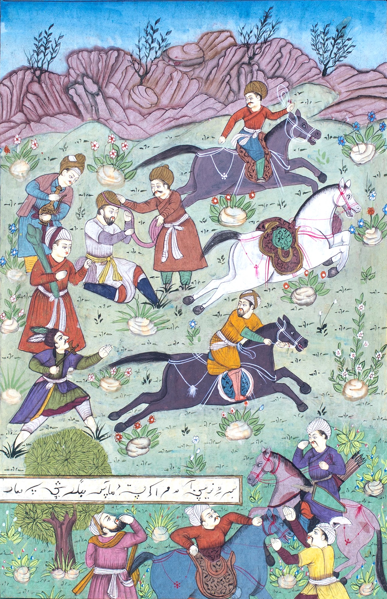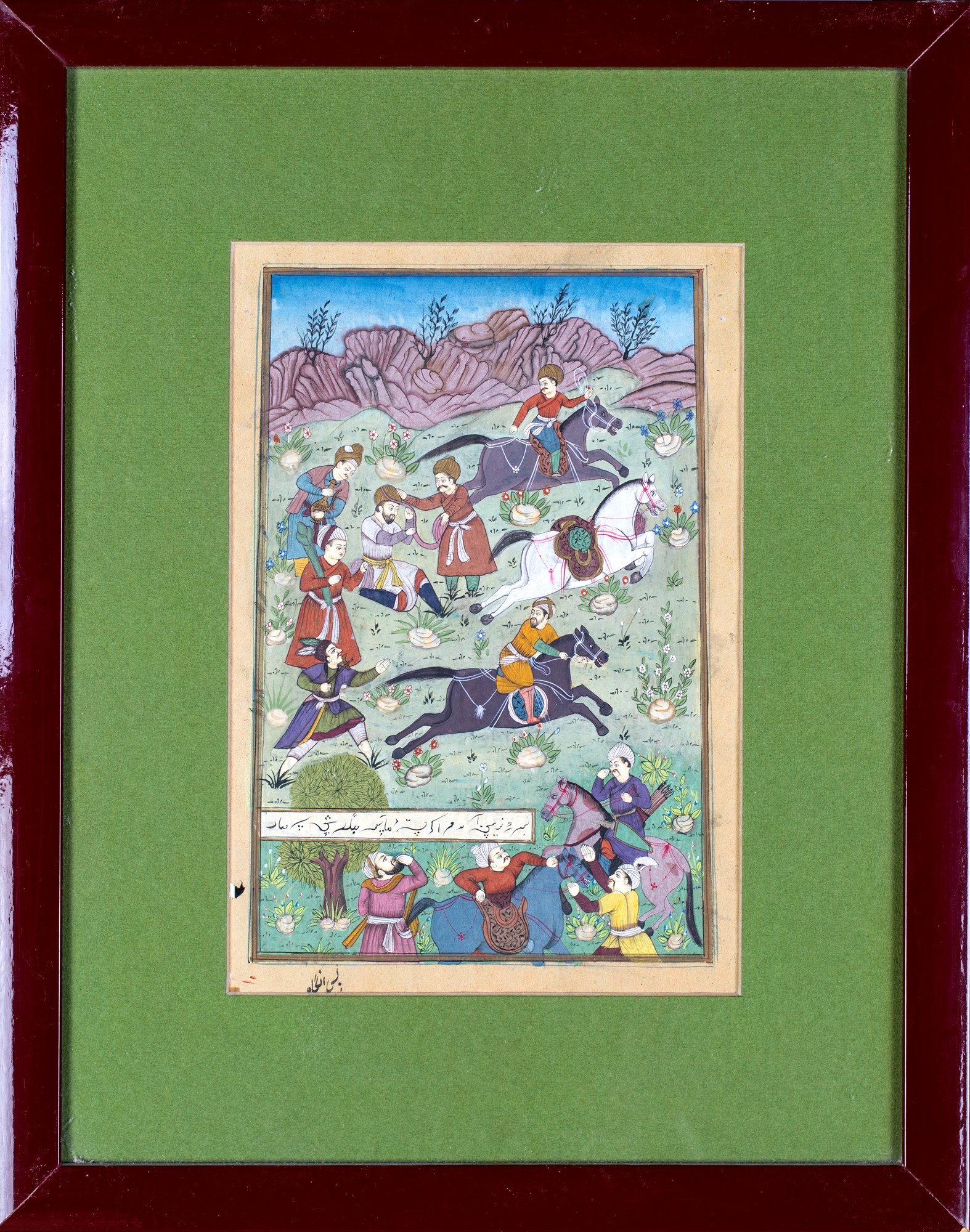 Pagina miniata e manoscritta, India, XIX secolo raffigurante un paesaggio con guerrieri, tratta dal poema epico Shah-Nameh (Il Libro dei Re) del poeta persiano Firdusi, china e tempera su carta, 29,5x20,5
