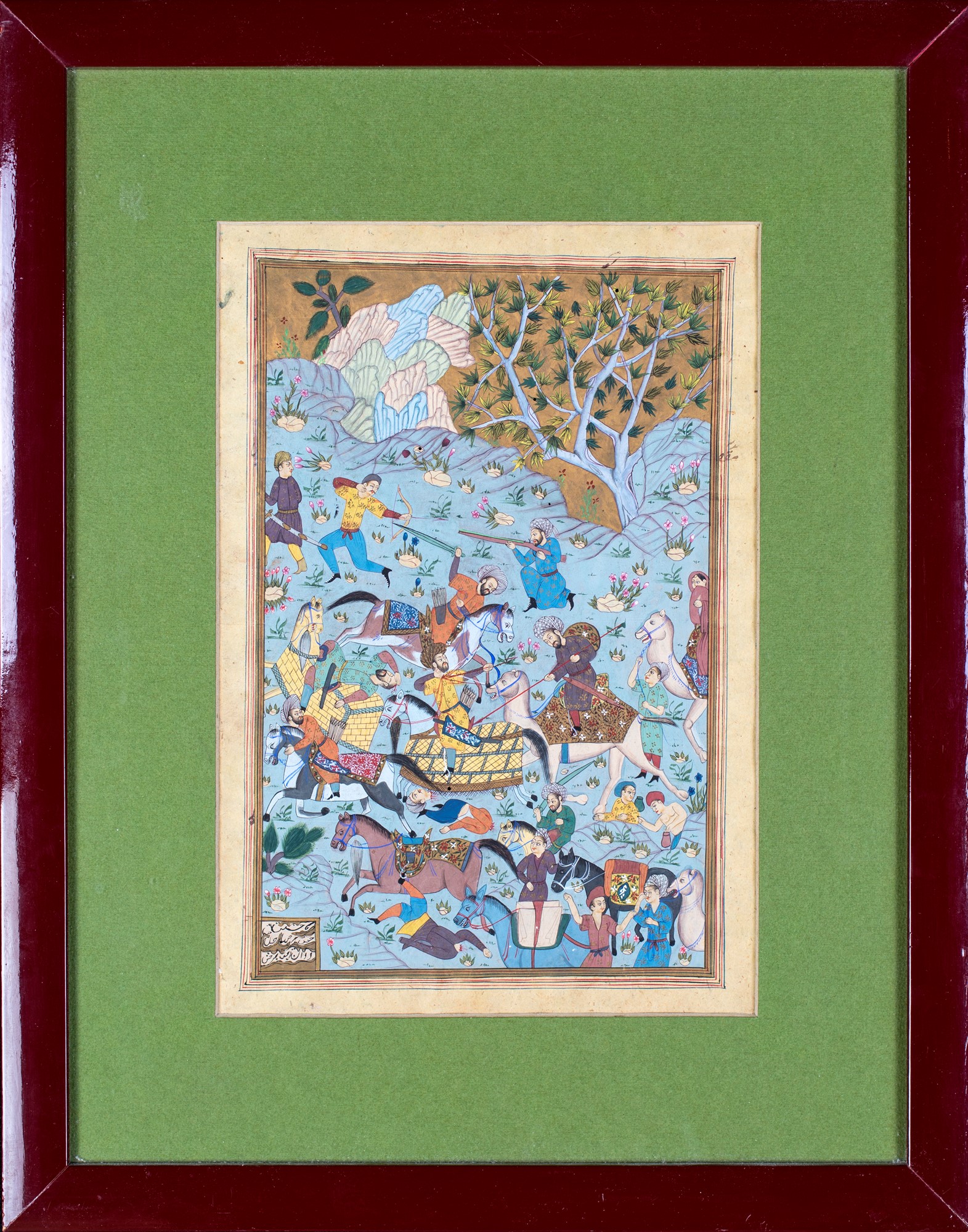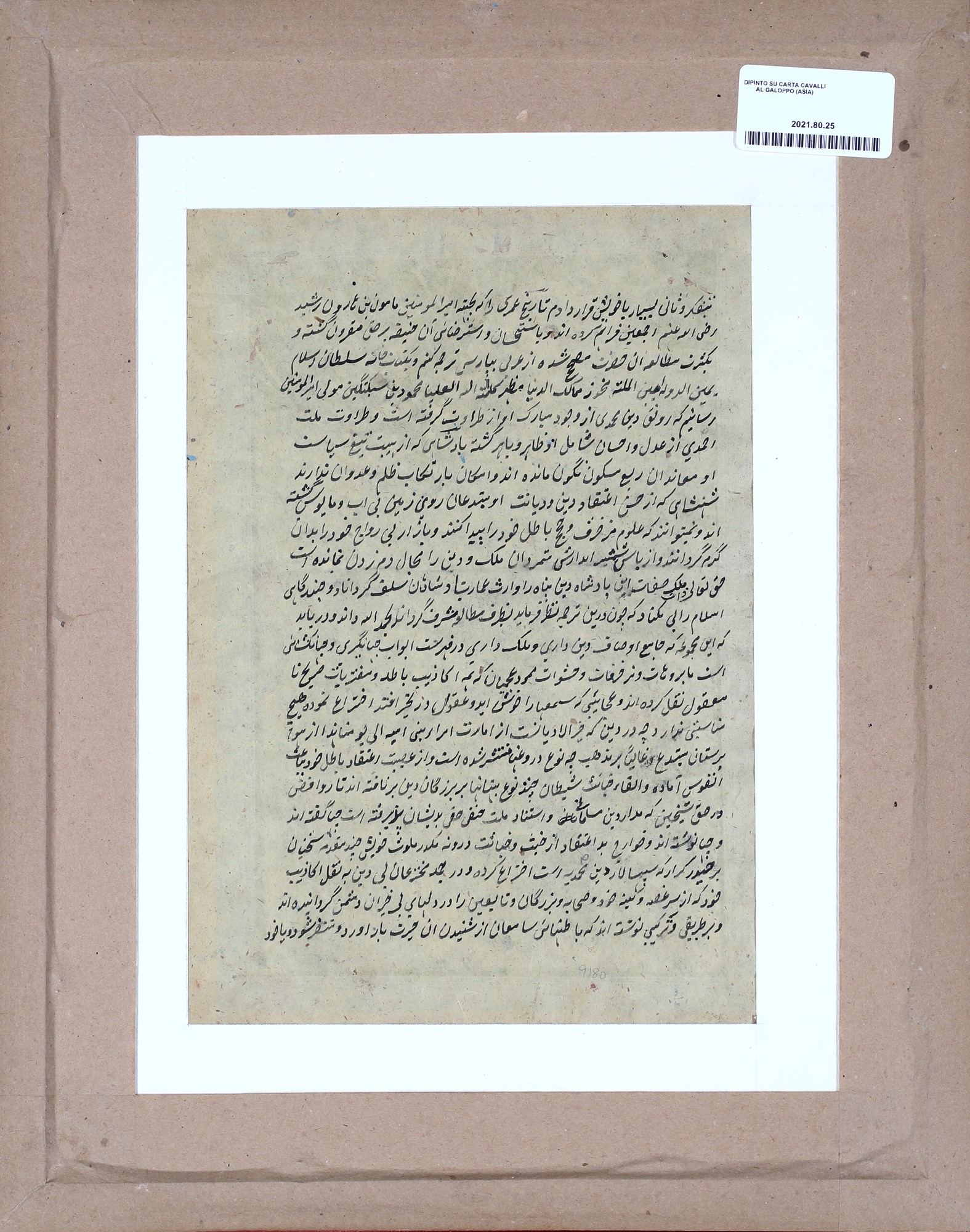 Pagina miniata e manoscritta, china e tempera su carta, India, XIX secolo raffigurante una scena di battaglia fra cavalieri e soldati, tratta dal poema epico Shah-Nameh (Il Libro dei Re) del poeta persiano Firdusi. Il componimento, uno dei poemi epici più lunghi del mondo, costituisce l'epica nazionale dei Paesi di lingua persiana e narra le gesta cavalleresche dell'epopea iraniana raccontando il passato mitico e storico dell'Iran dalla creazione del mondo fino alla conquista islamica del VII secolo, 29x20