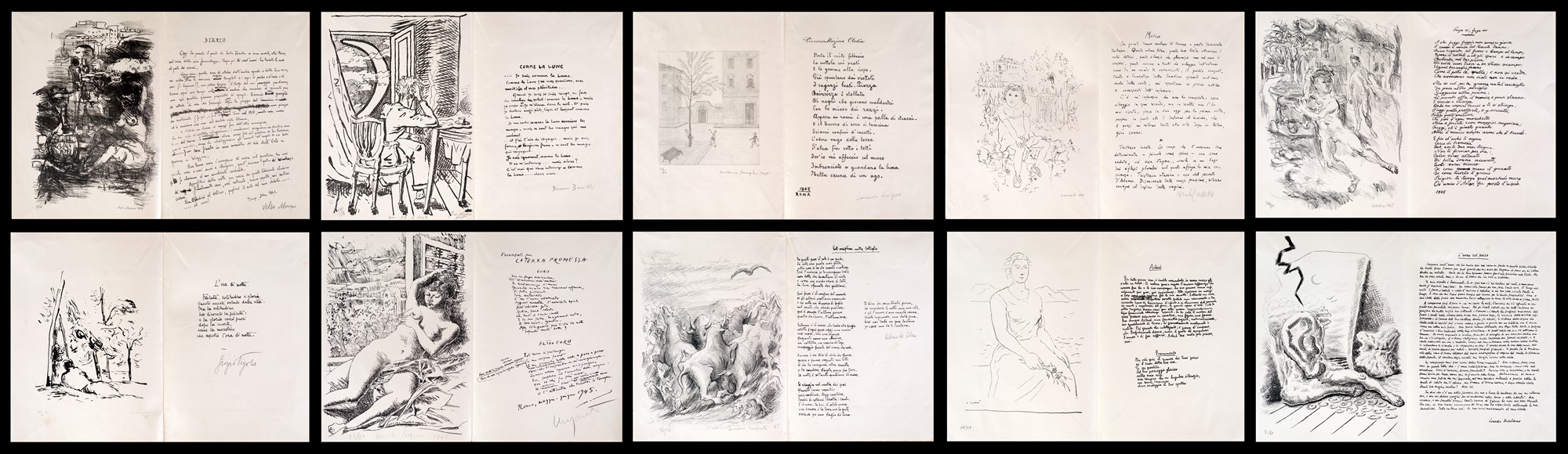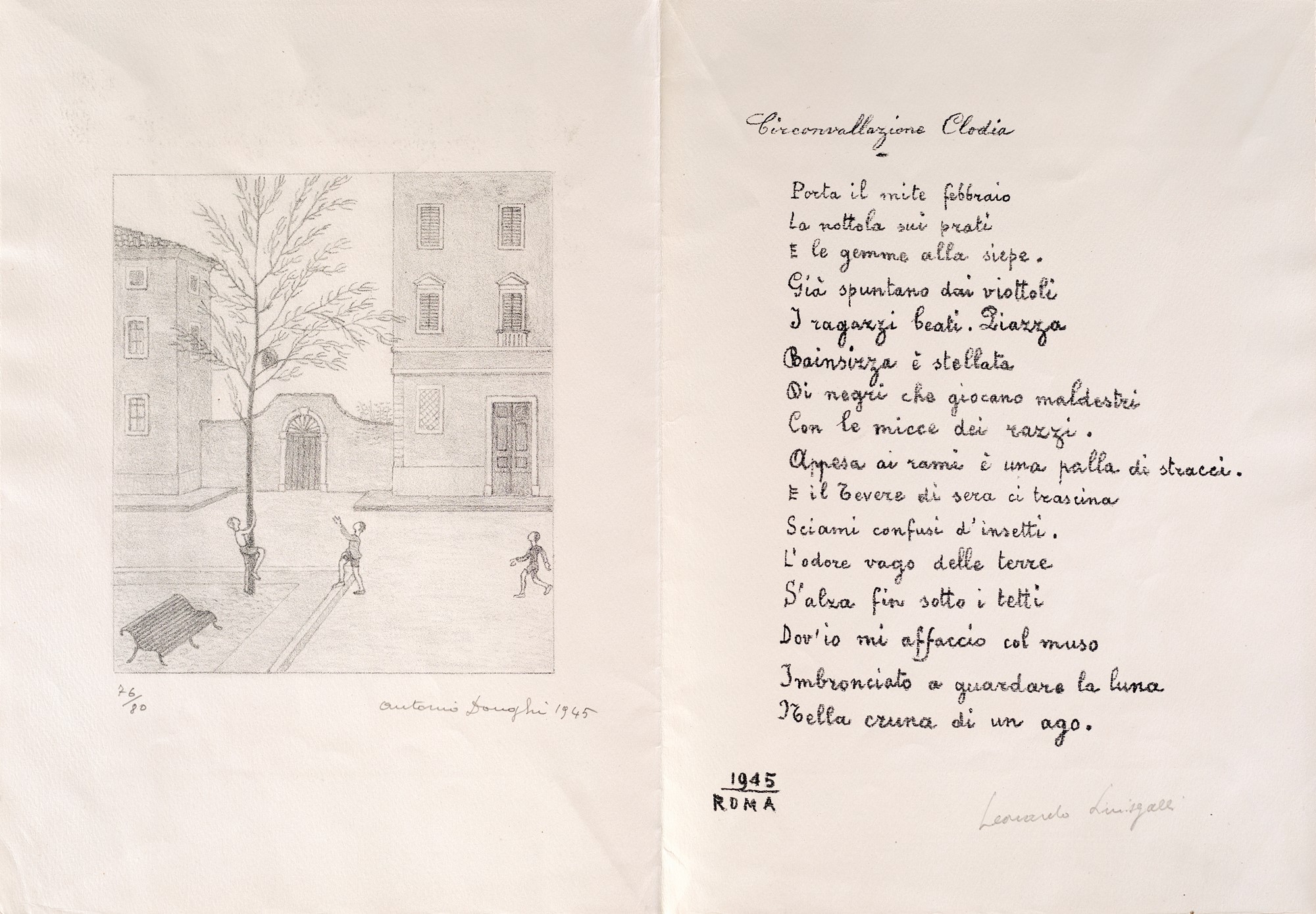 3) Circonvallazione Clodia, poesia di Leonardo Sinisgalli e litografia di Antonio Donghi, 1945. Esemplare 76/80. Firma, data e numerazione "Antonio Donghi, 1945, 76/80". Firma di Leonardo Sinisgalli.