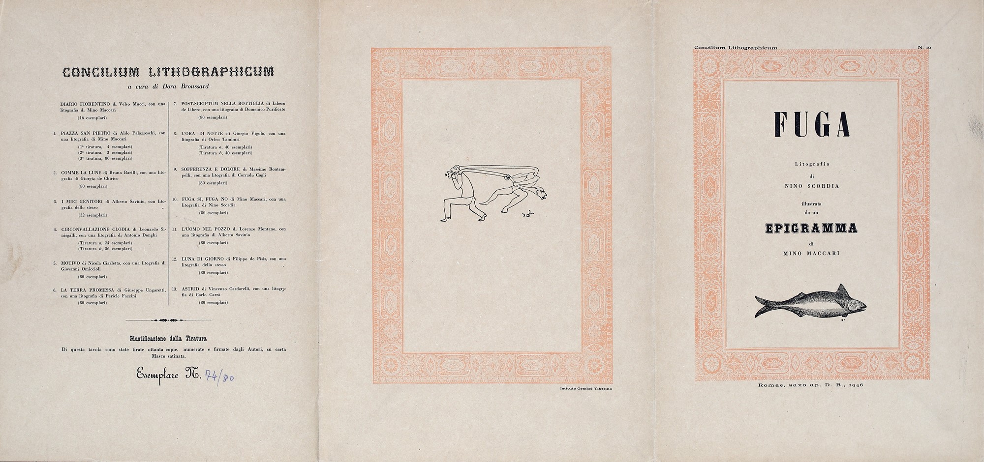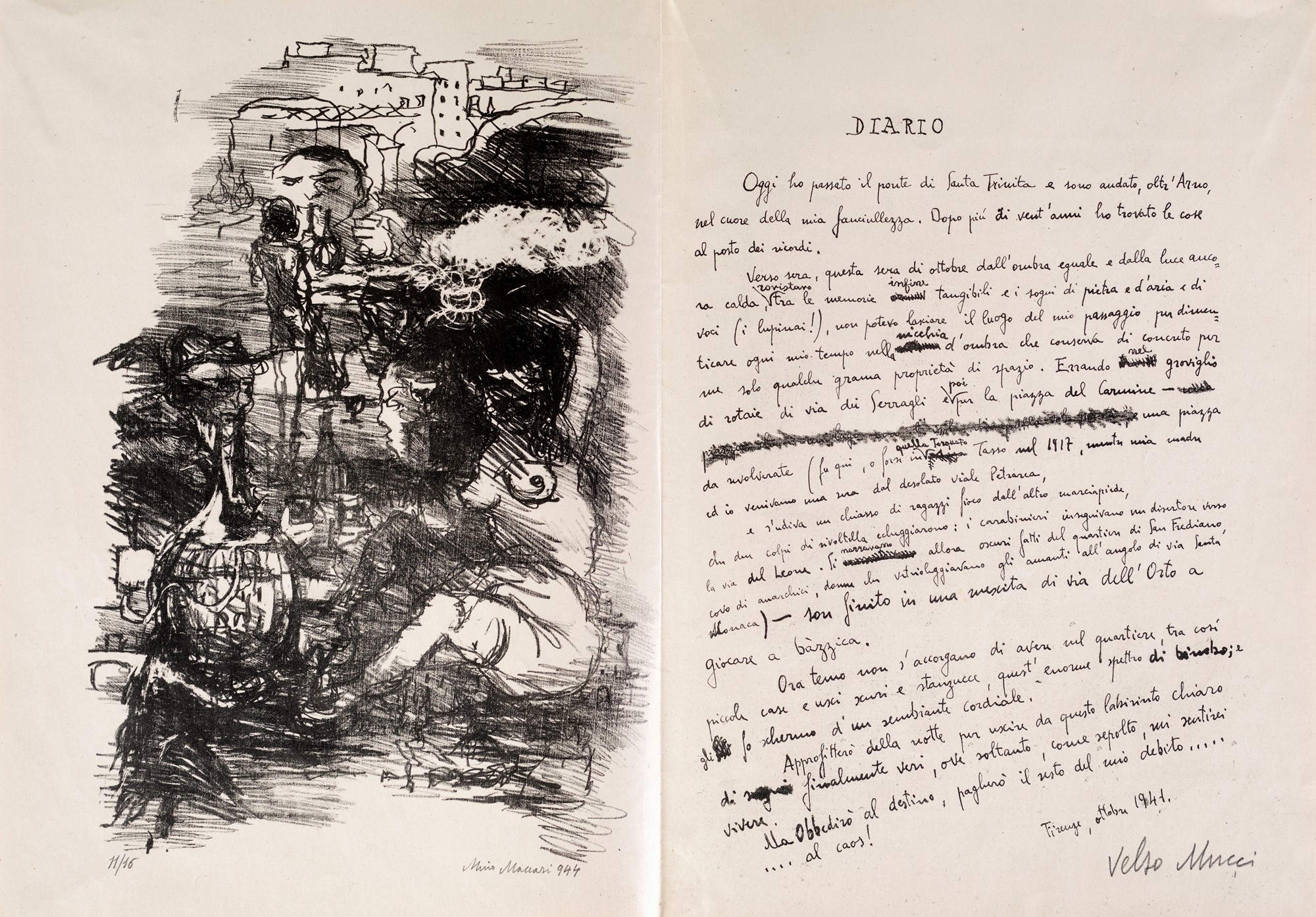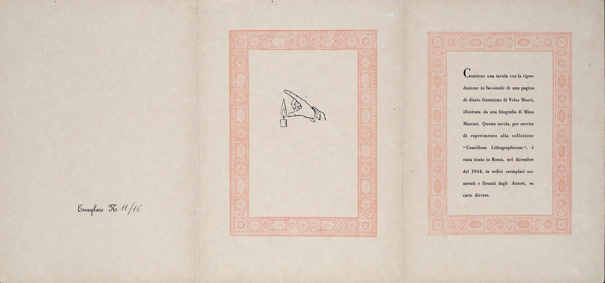 1) Esperimento alla collezione, Velso Mucci con litografia di Mino Maccari, 1944. Esemplare 11/16. Firma, data e numerazione di pugno di Mino Maccari. Firma di Velso Mucci.
