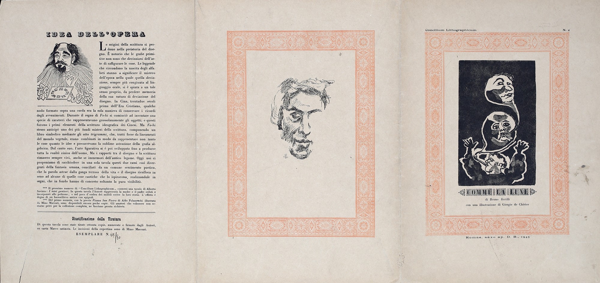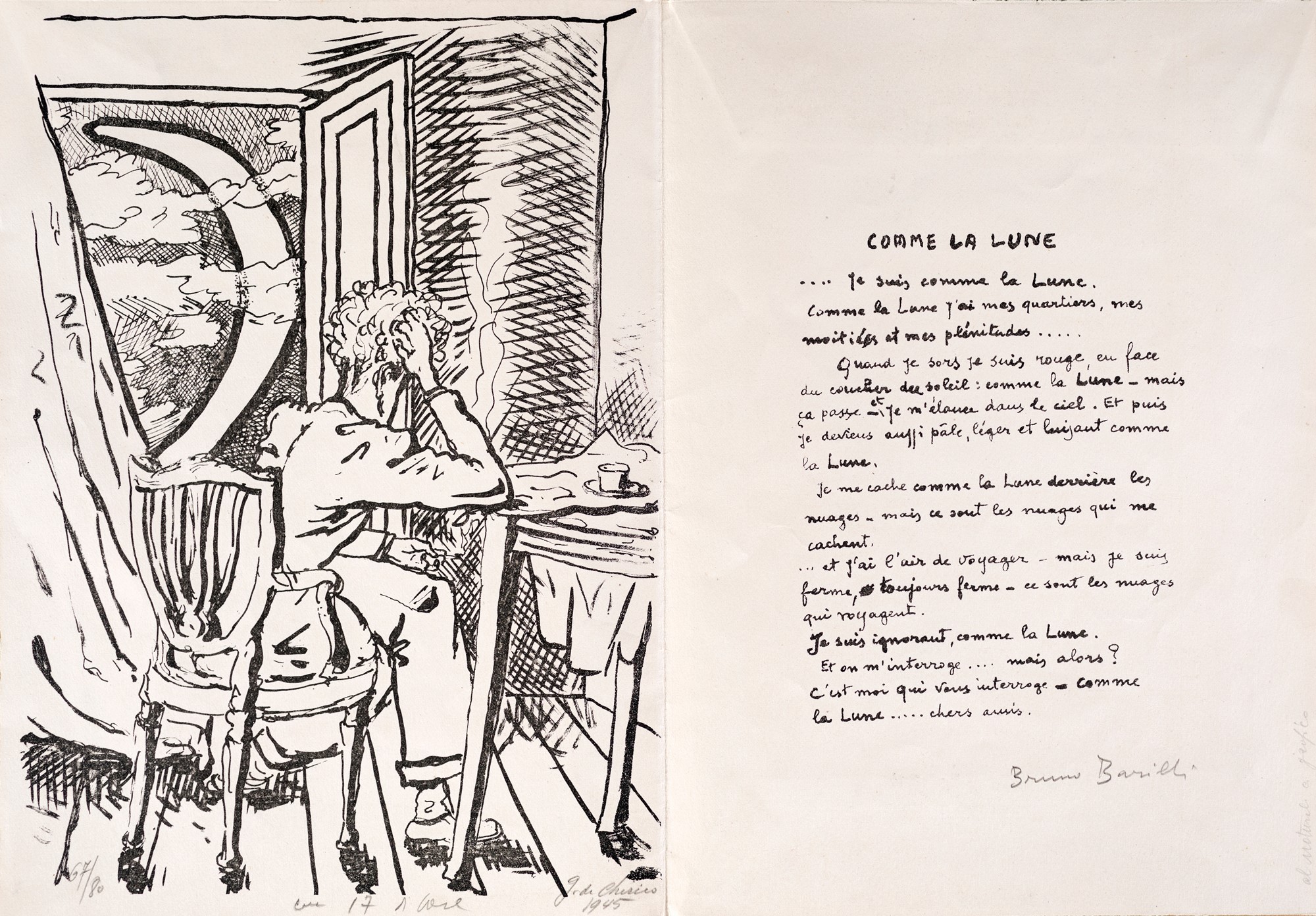 2) Comme la lune, Bruno Barilli con litografia di Giorgio de Chirico, 1945. Esemplare 67/80. Firma data e numerazione "Giorgio De Chirico, 1945, 67/80". Firma di Bruno Barilli. lievi difetti