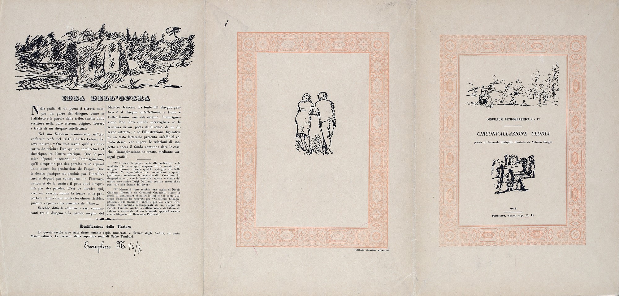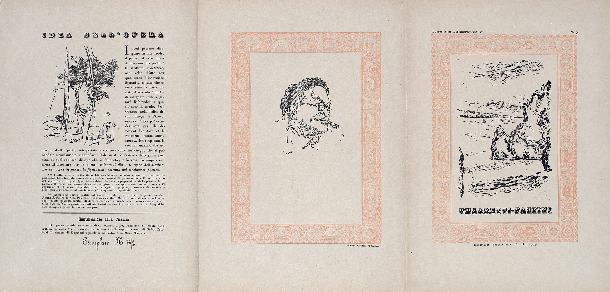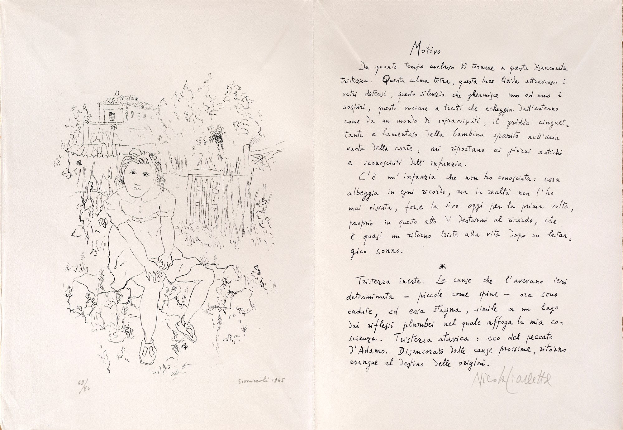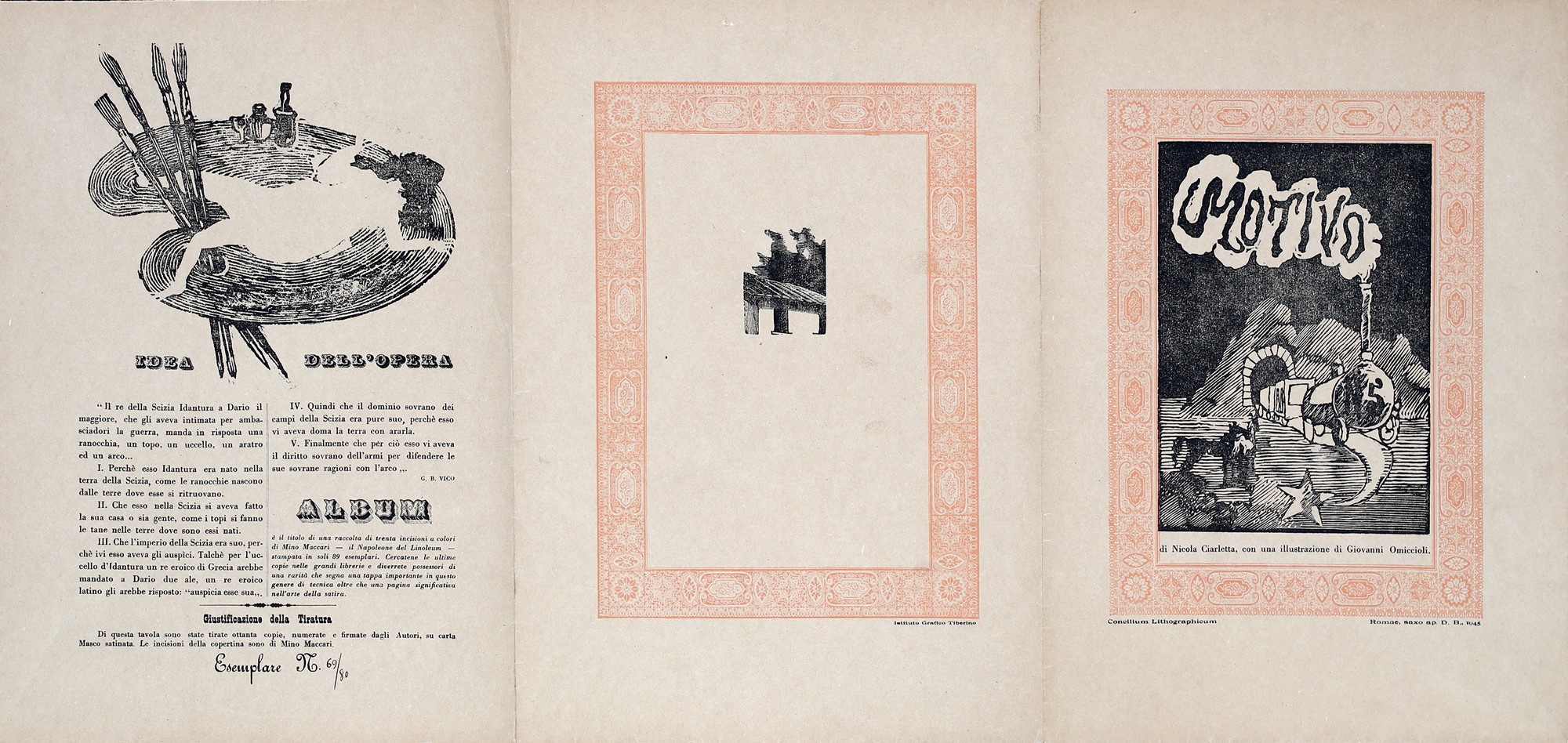 4) Motivo, testo di Nicola Ciarletta e litografia di Giovanni Omiccioli, 1945. Esemplare 69/80. Firma, data e numerazione "G. Omiccioli, 1945, 69/80". Firma di Nicola Ciarletta