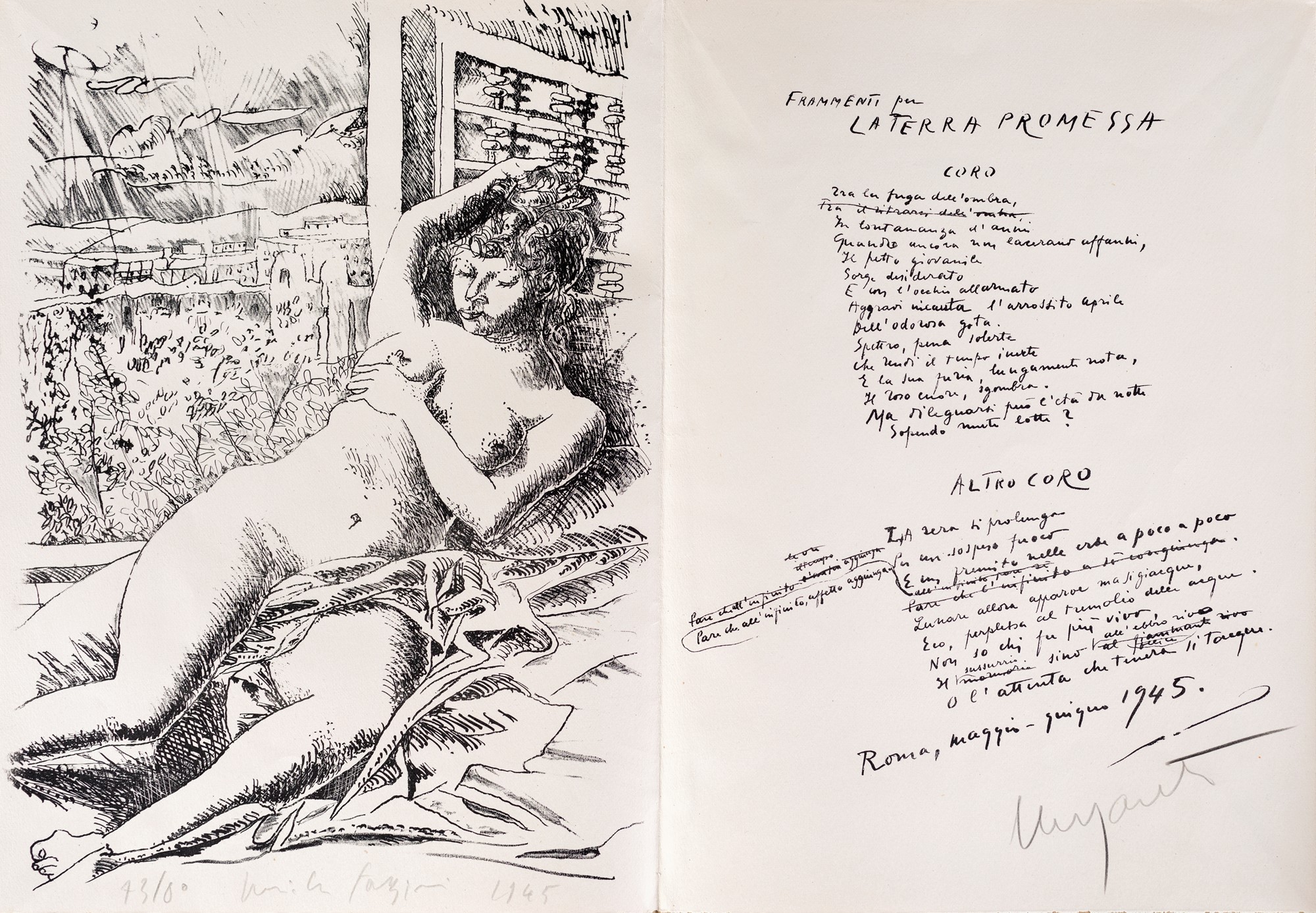 5) Frammenti per la terra promessa, poesia di Giuseppe Ungaretti e litografia di Pericle Fazzini, 1945. Esemplare 73/80. Firma, data e numerazione "Pericle Fazzini, 1945, 73/80". Firma di Giuseppe Ungaretti.