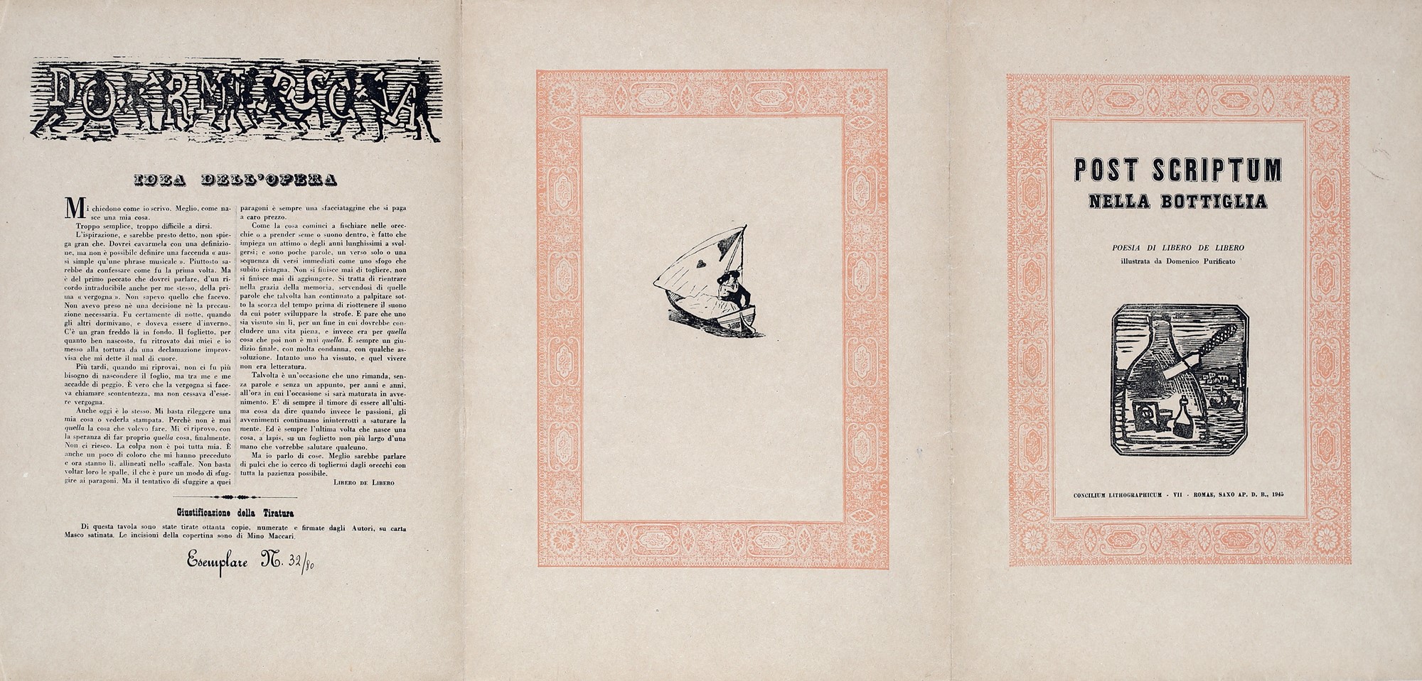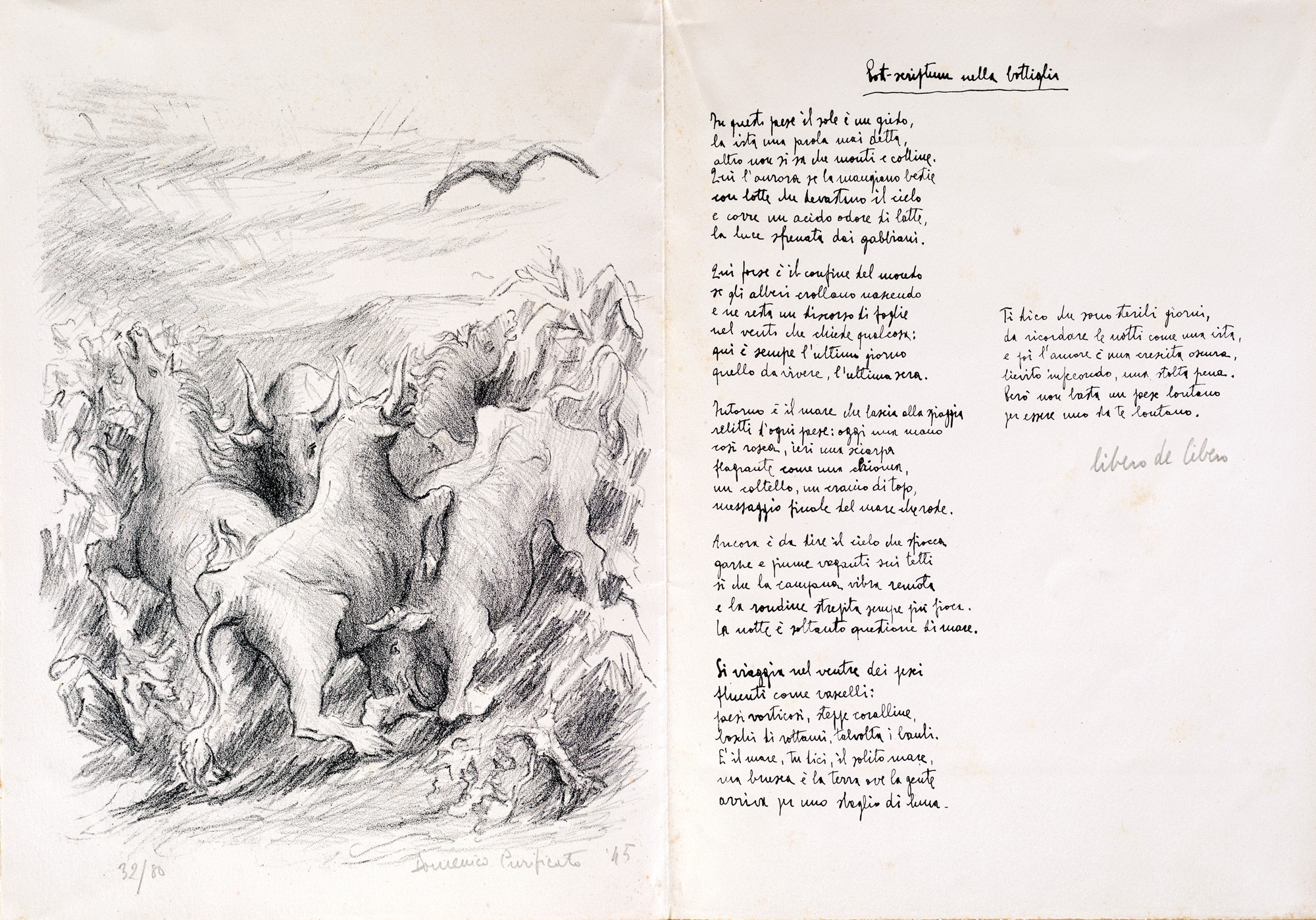 6) Post scriptum nella bottiglia, poesia di Libero de Libero e litografia di Domenico Purificato, 1945. Esemplare 32/80. Firma, data e numerazione "Domenico Purificato, 1945, 32/80". Firma di Libero de Libero.