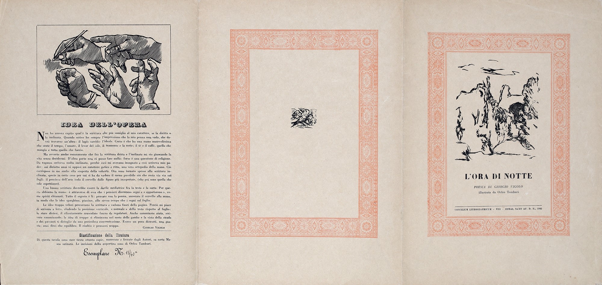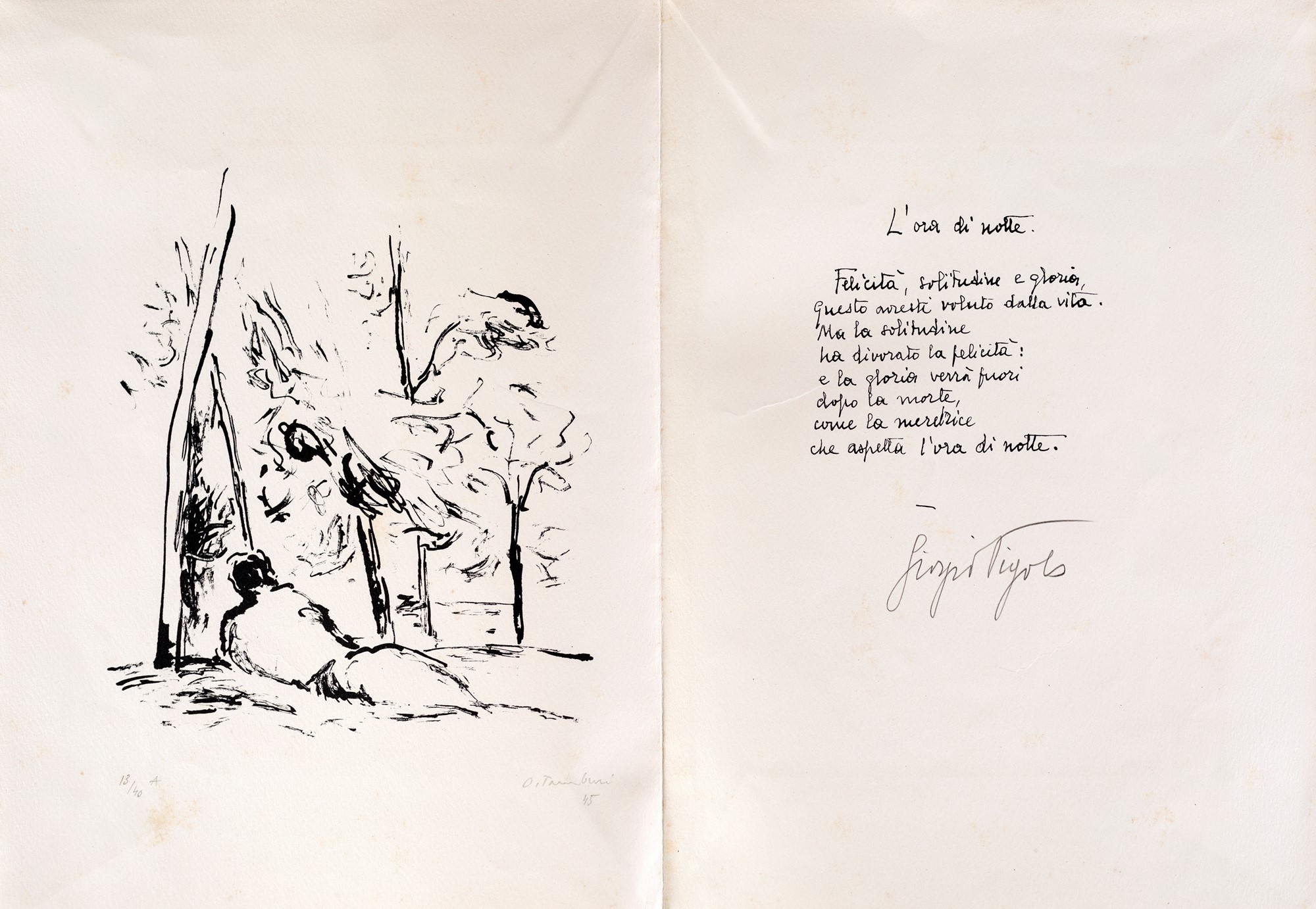 7) L'ora di notte, poesia di Giorgio Vigolo e litografia di Orfeo Tamburi, 1945. Esemplare 13/40. Firma, data e numerazione "O. Tamburi, '45, 13/40". Firma Giorgio Vigolo.