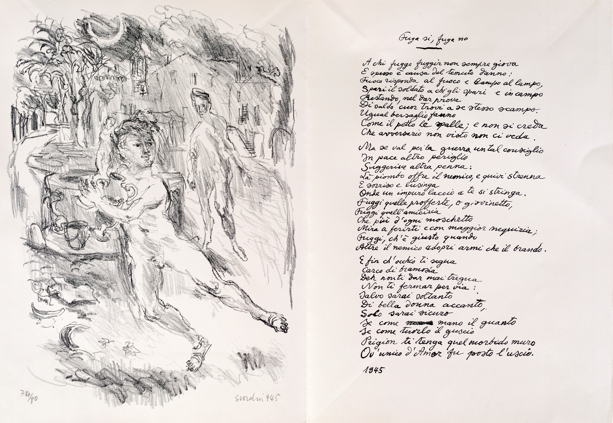 8) Fuga, epigramma di Mino Maccari e litografia di Nino Scordia, 1946. Esemplare 74/80. Firma, data e numerazione "Scordia '45, 74/80".