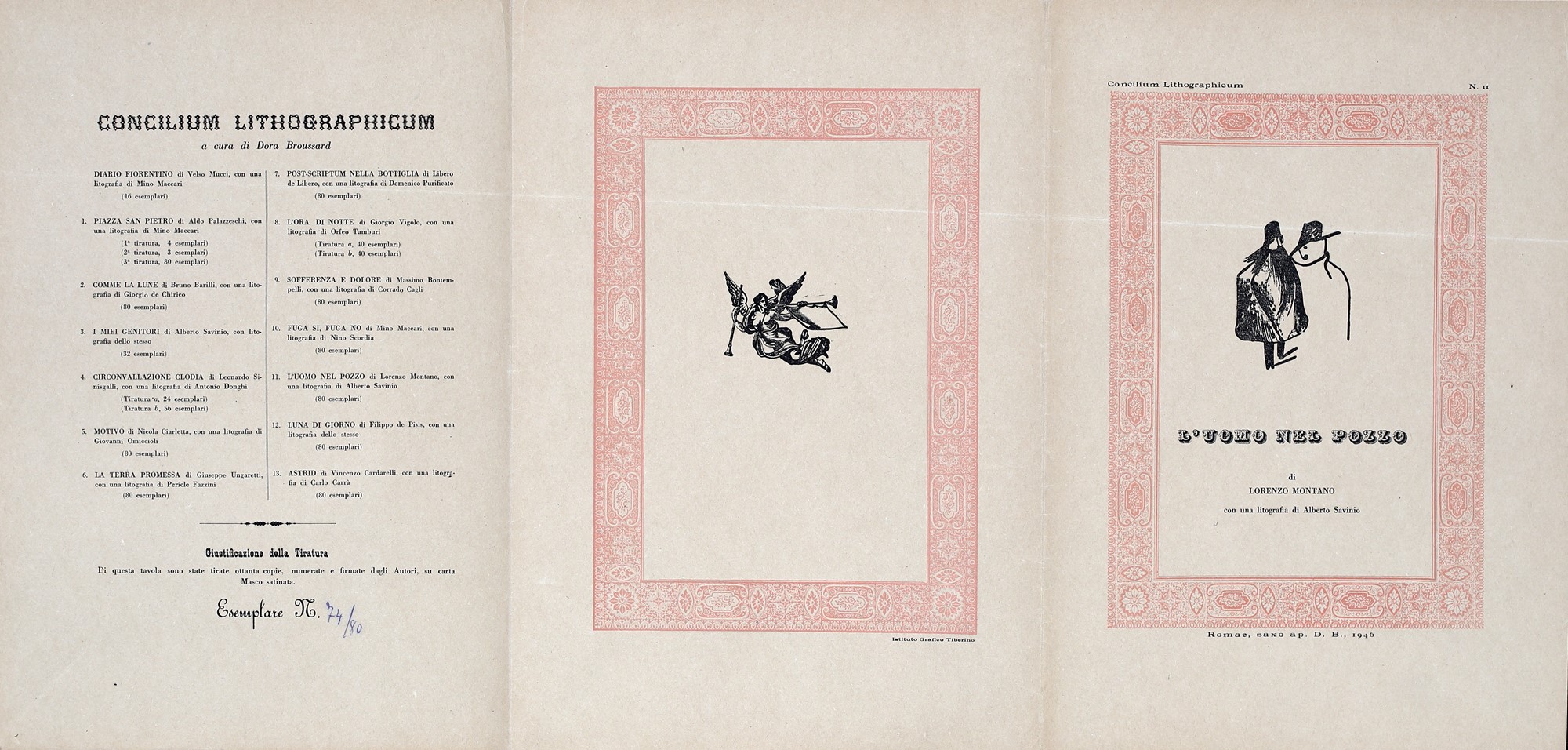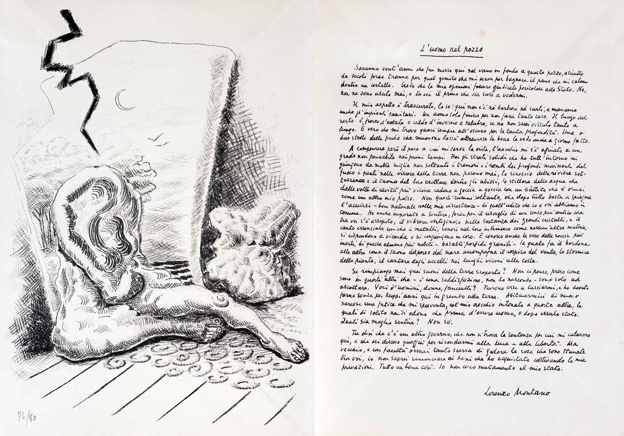 9) L'uomo nel pozzo, testo di Lorenzo Montano e litografia di Alberto Savinio, 1946. Esemplare 74/80.