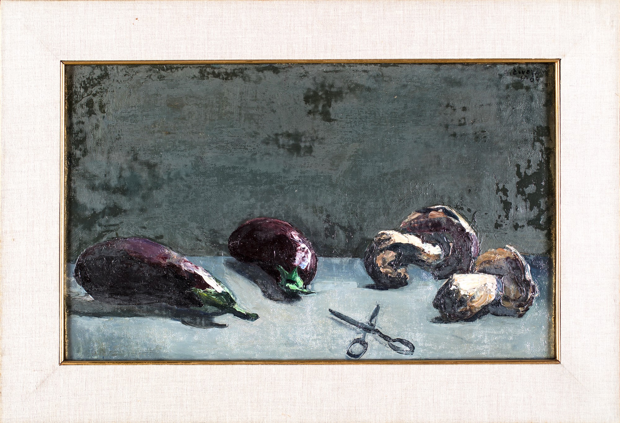 Alberto Ziveri, Melanzane e funghi, 1964 Olio su tela cm 30x50 Firma in alto...