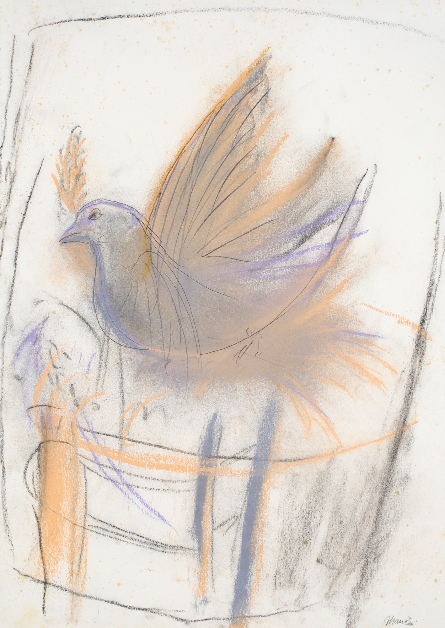 Giacomo Manzù, Colomba della pace, Tecnica mista (Matita, carboncino, pastelli cerosi) su carta cm 71,5x51 Firma sul fronte in basso a destra "Manzù".