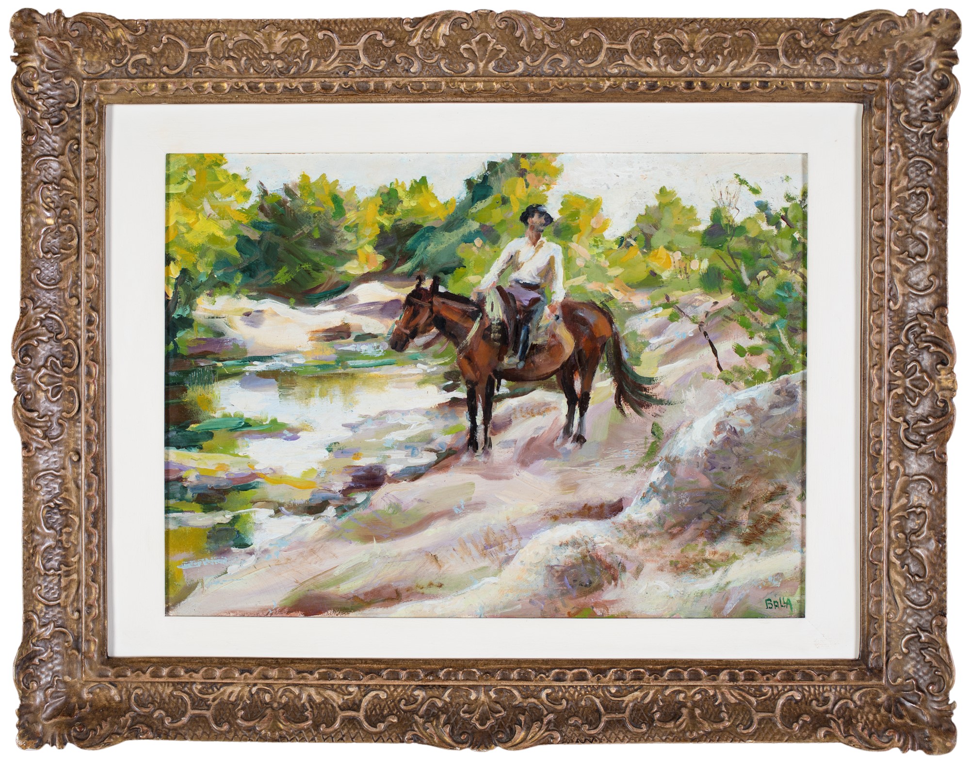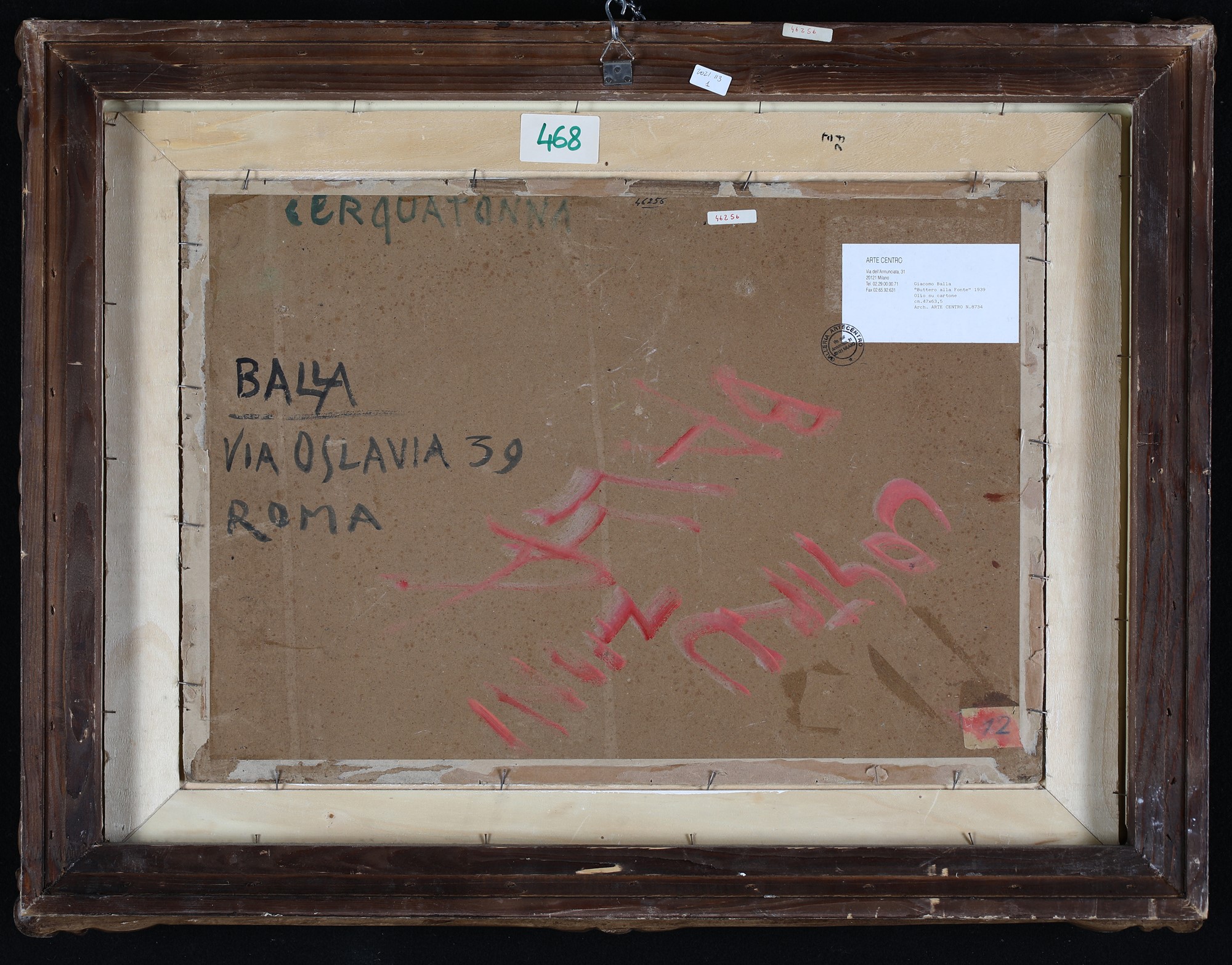 Giacomo Balla, Cavaliere a Campagnano, 1935 c. Olio su masonite cm 45,5x63,5 Firma in basso a destra "Balla". Al verso reca "Balla, via Oslavia 39". Al verso reca etichetta e timbro della Galleria Arte Centro (Milano).