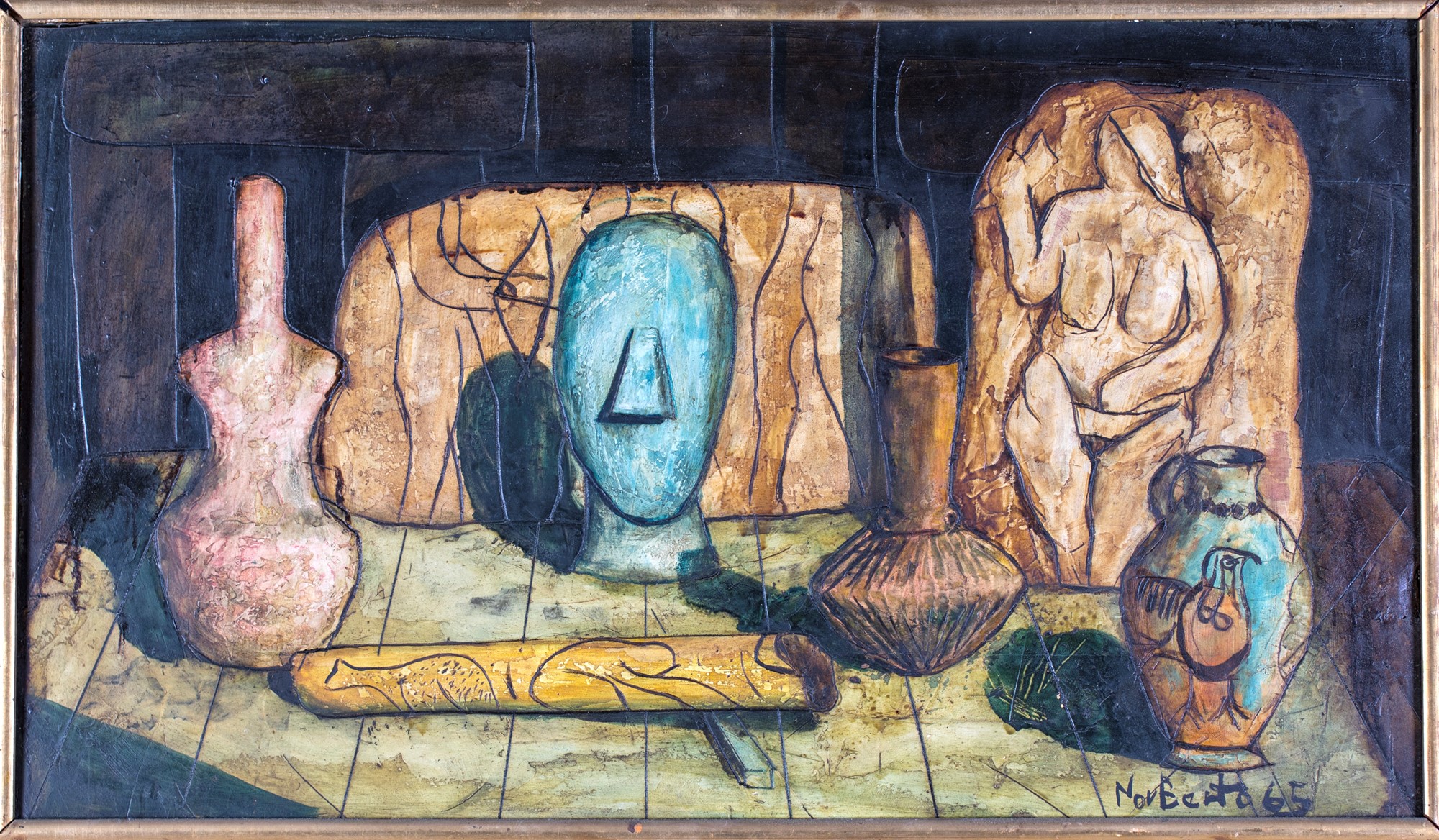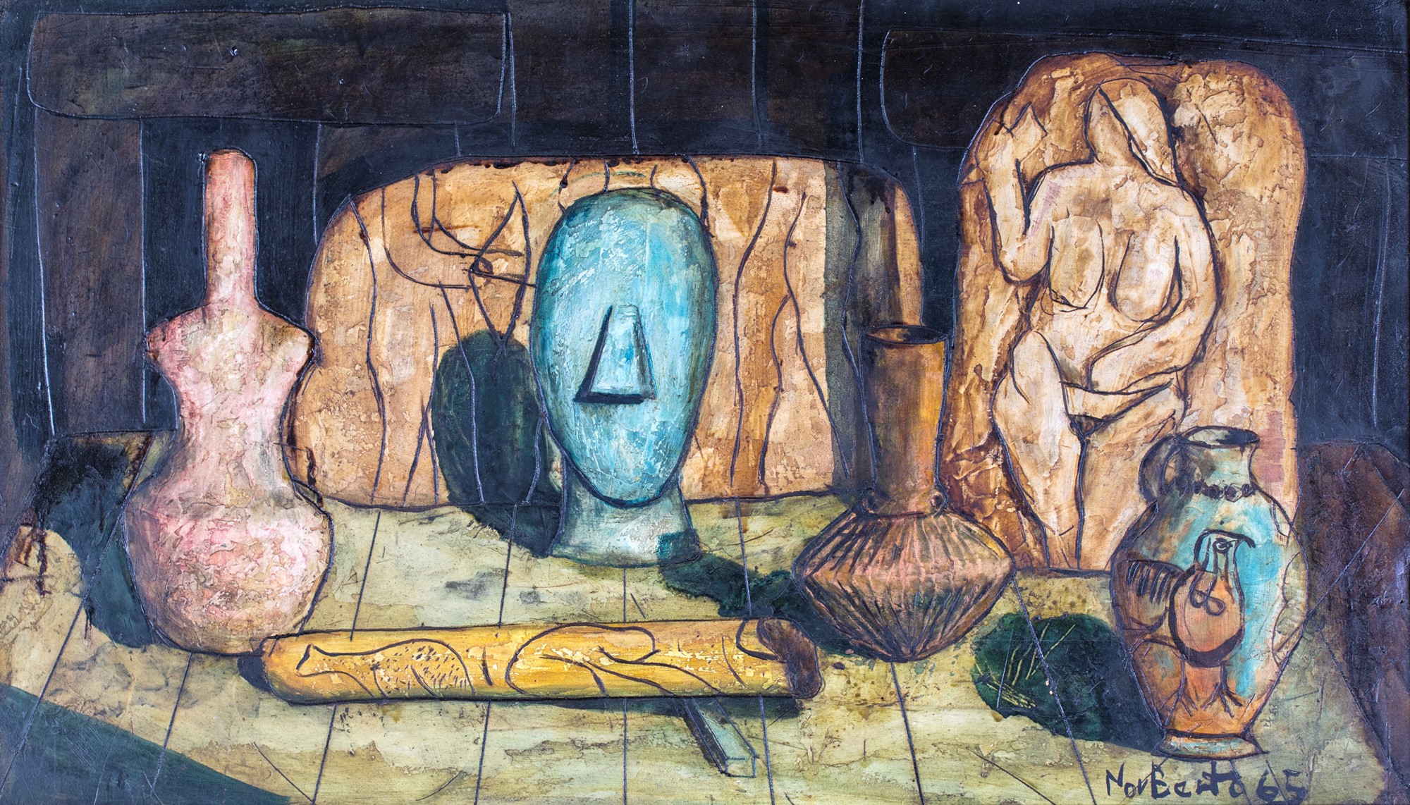 Norberto Proietti, Natura Morta, 1965 Olio su tavola cm 42x75 Firma e data sul fronte in basso a destra "Norberto '65".