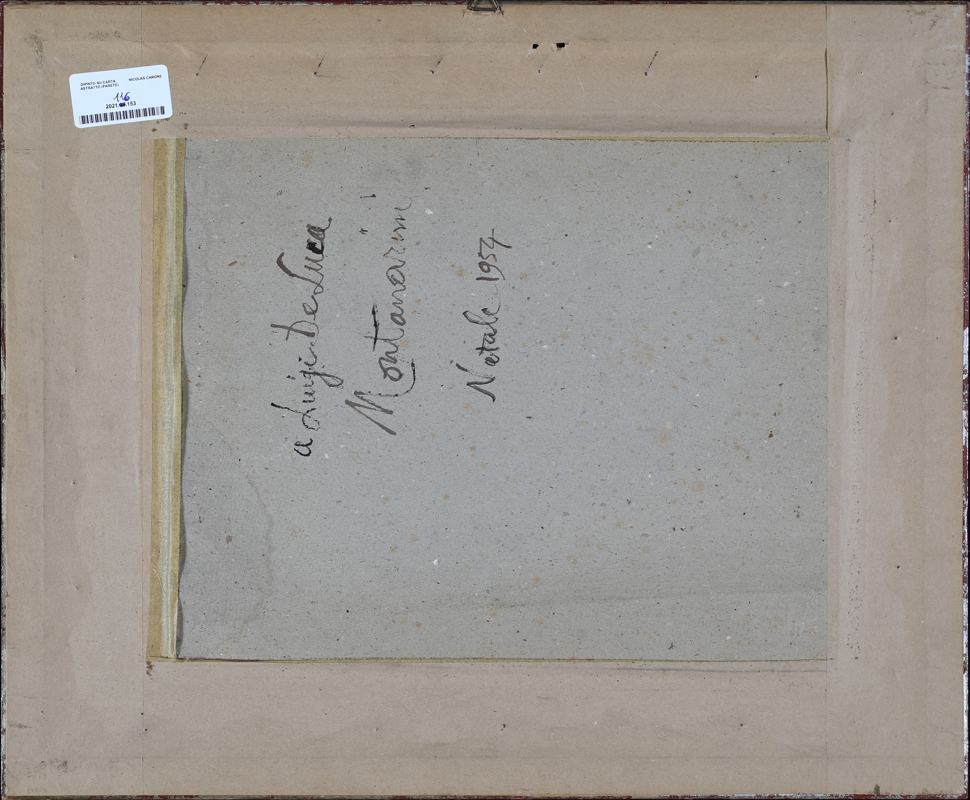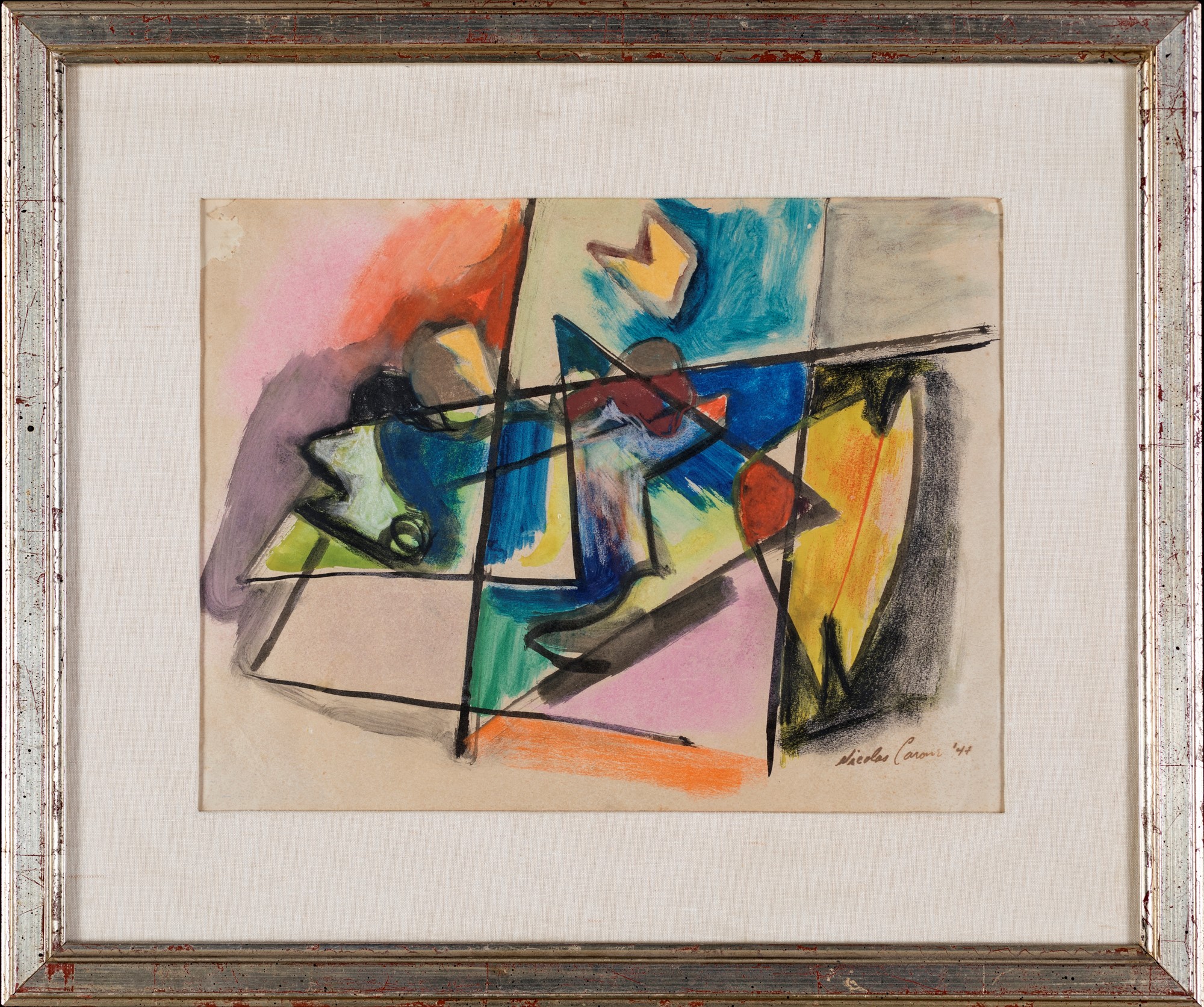 Nicolas Carone, Senza titolo, 1947 Acquarello e pastelli cerosi su carta cm 28,5x37 Firma e data sul fronte in basso a destra "Nicolas Carone '47". Al verso reca dedica "A Luigi De Luca, Montanarini, Natale 1954". Mancanza della carta in alto a sinistra