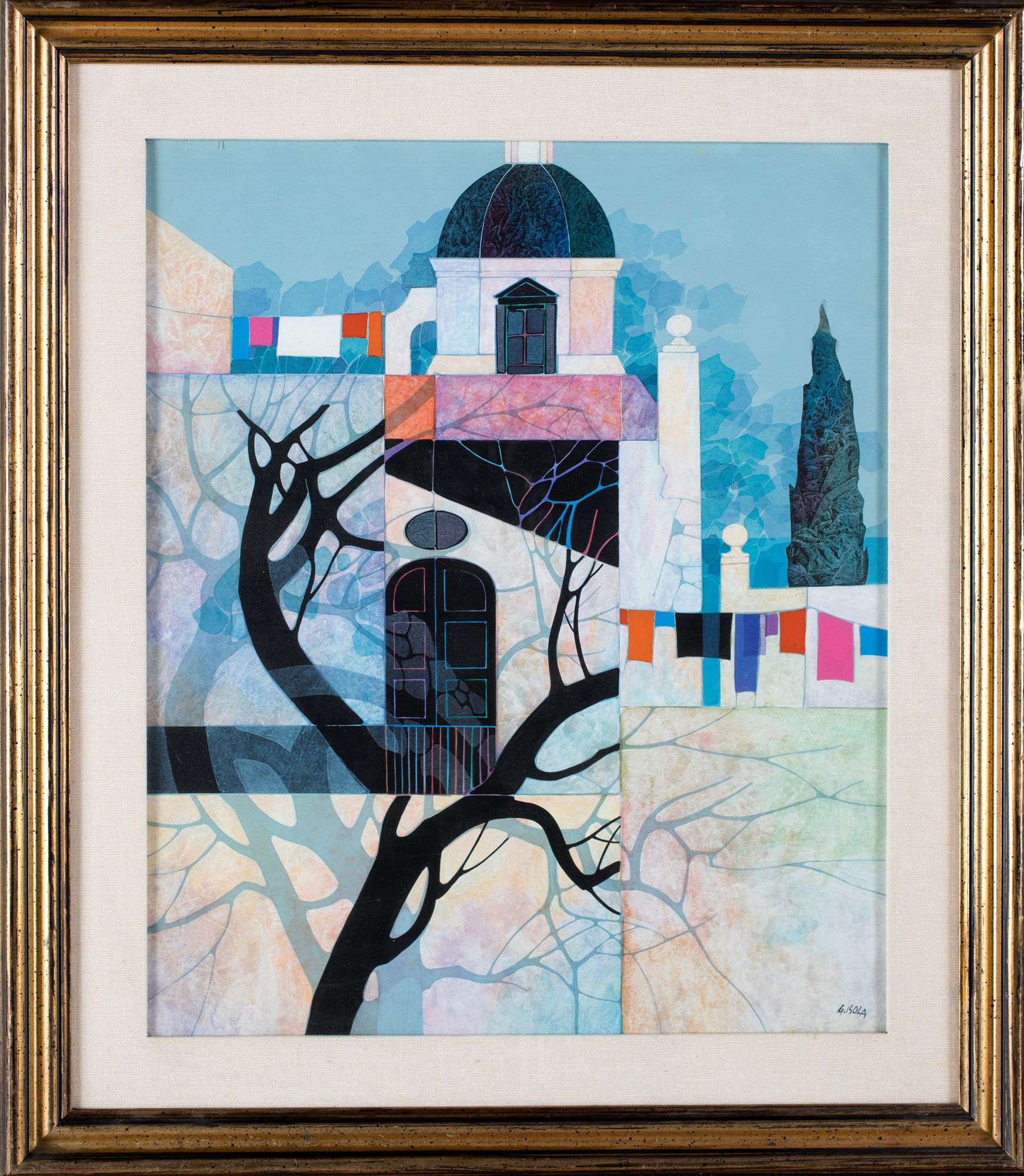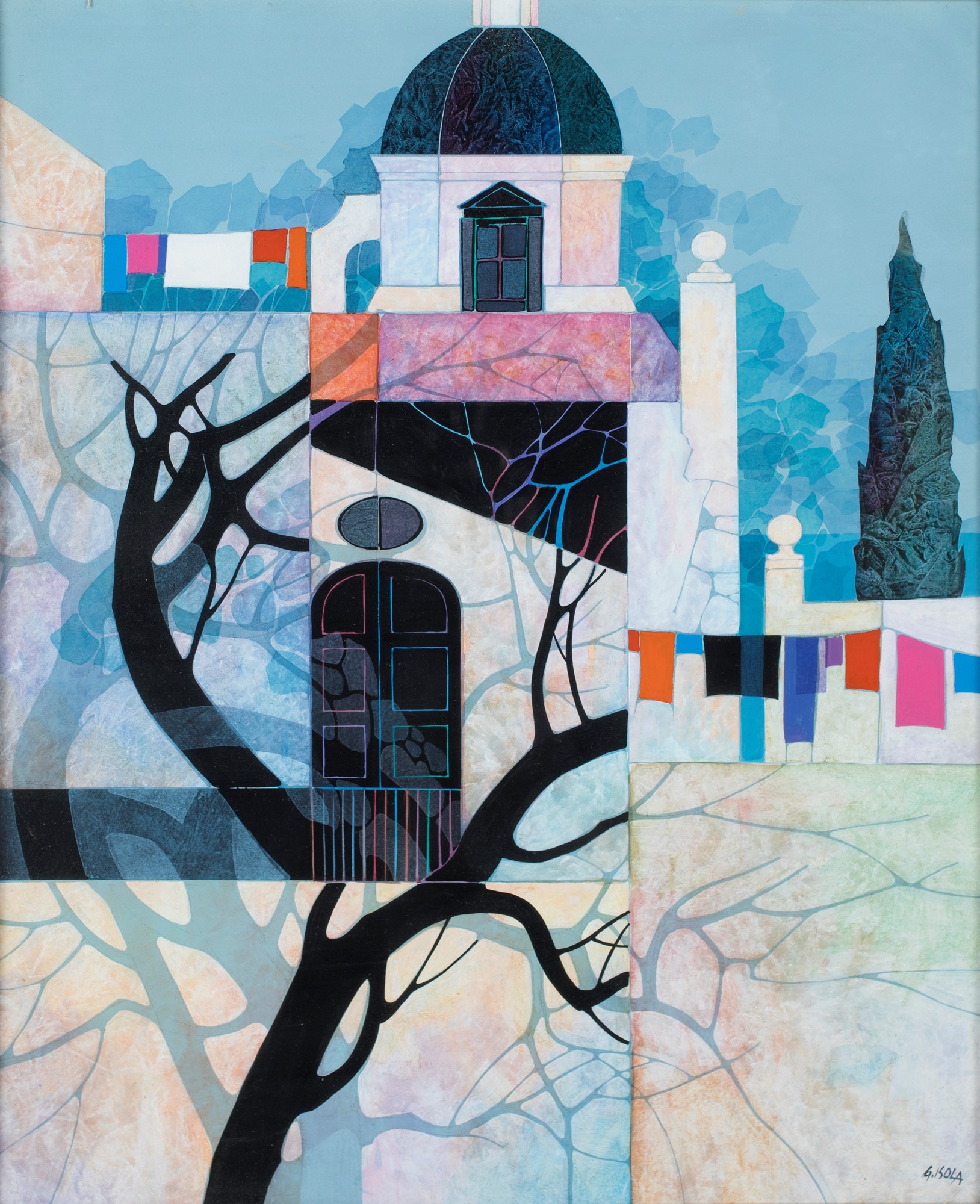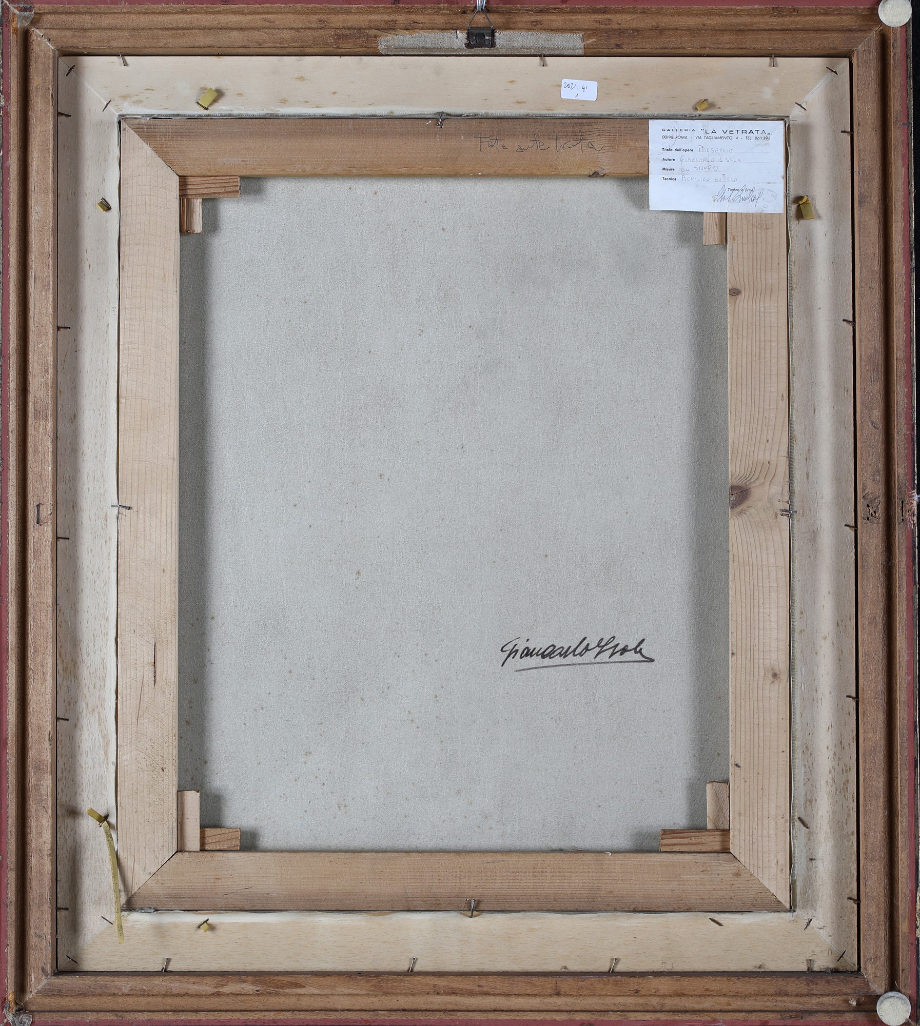 Giancarlo Isola, Paesaggio, Acrilici su tela cm 60x50 Firma sul fronte. Al verso reca firma ed etichetta della "galleria La Vetrata", Roma.