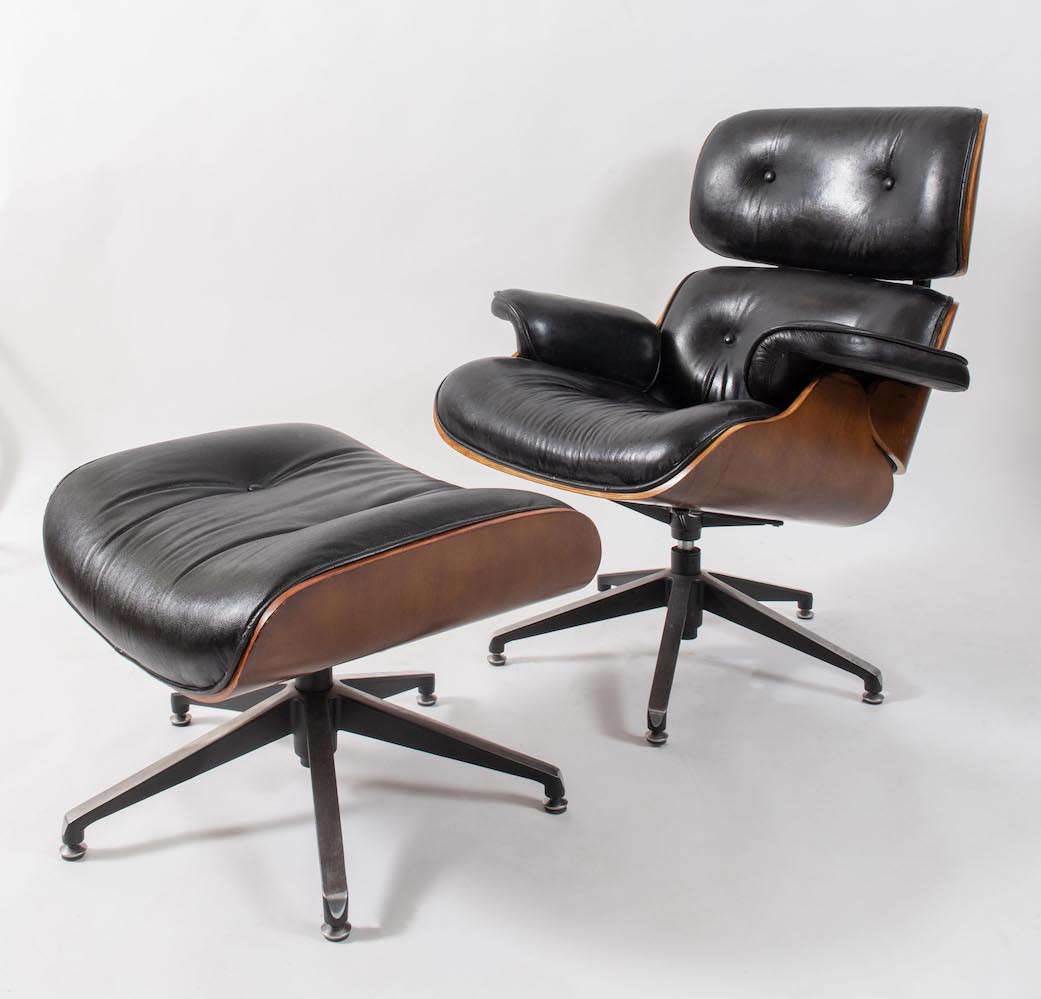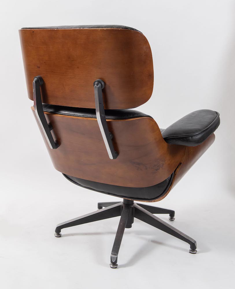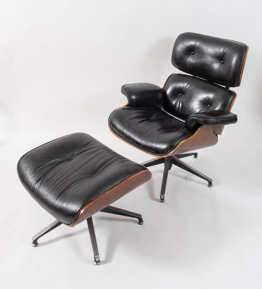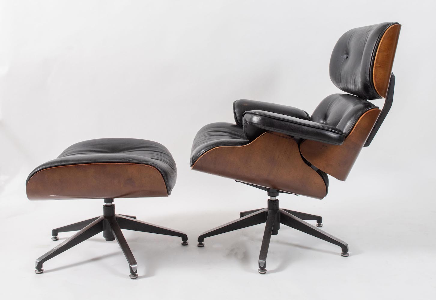 CHARLES EAMES, after. Replica della poltrona modello 670 e del poggiapiedi modello 671 in palissandro e in similpelle. Prod. Herman Miller Replica, America, 1956 ca. Rispettivamente di cm 80x82x55 e cm 42x65x53. (difetti)