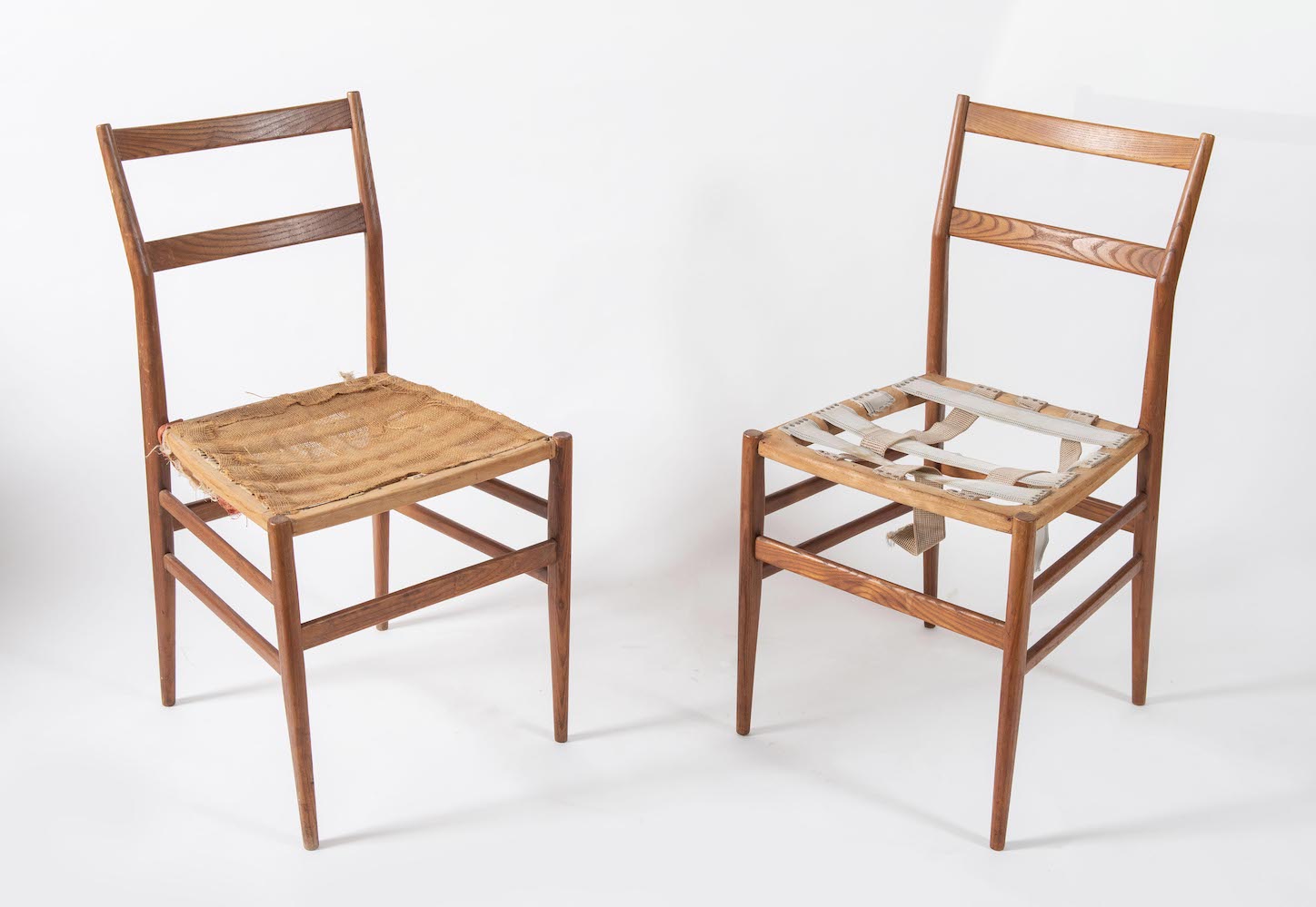 GIO PONTI Coppia di sedie in legno di frassino modello Leggera. Prod. Cassina, Italia, 1957 ca. Cadauna di cm 36,5x40x81,5. (Difetti) Pubblicazioni: Repertorio 1950-80, Mondadori, Giuliana Gramigna, 1985.