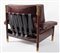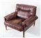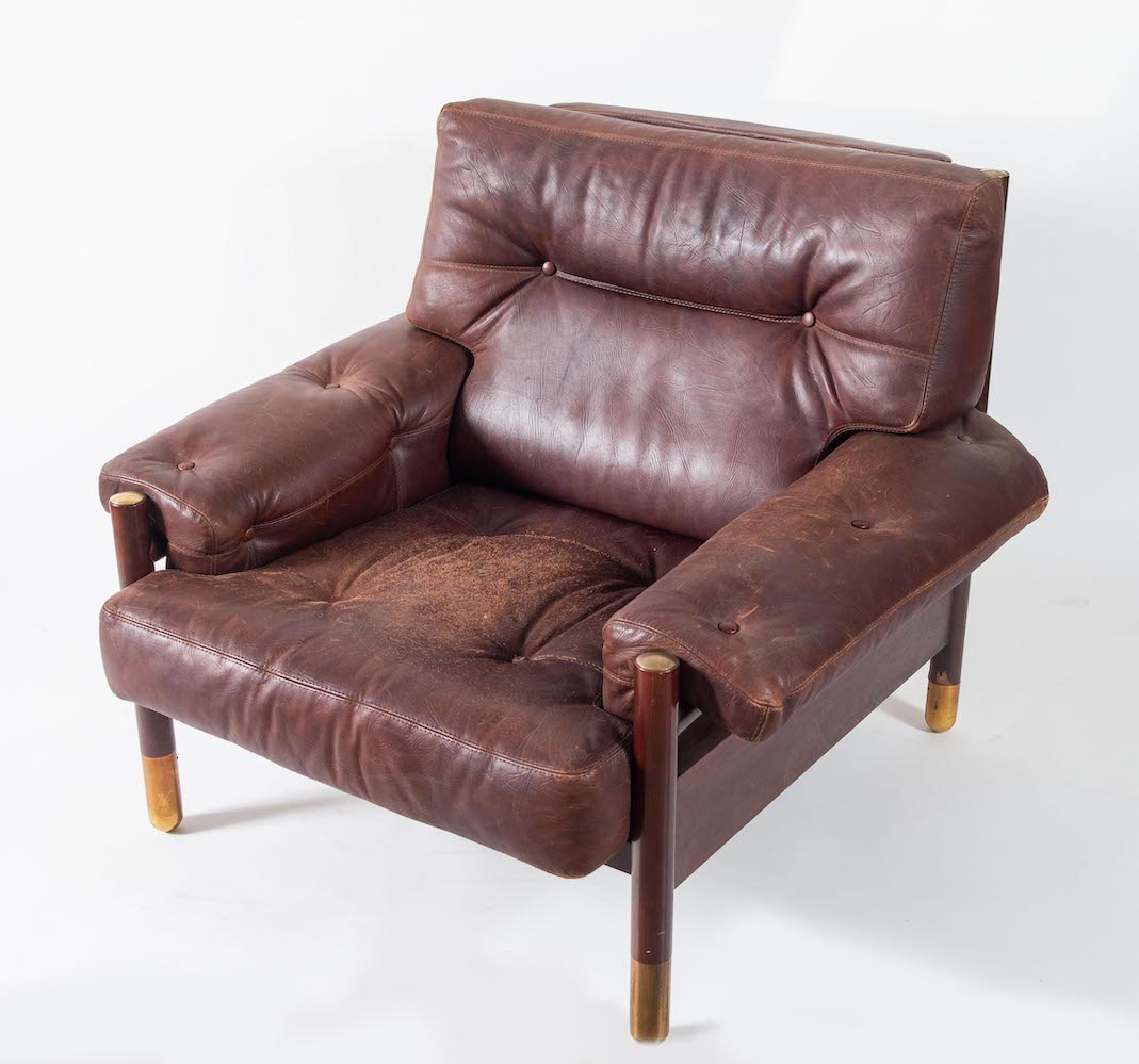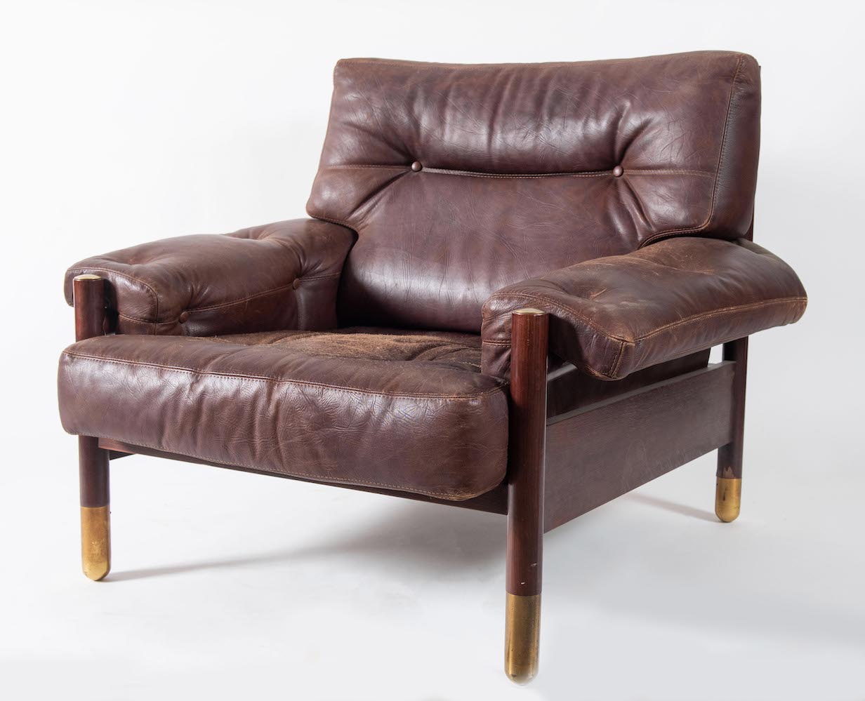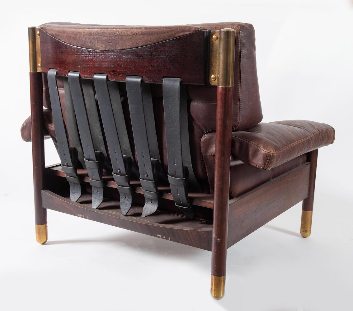 CARLO DE CARLI Poltrona Sella con struttura in palissandro brasiliano, rifiniture in ottone; seduta e schienale in pelle. Lievi difetti. Prod. Sormani, Italia, 1960 ca. Cm 83x100x95. Pubblicazioni: Domus, n. 440, Luglio 1966, pag. 83.