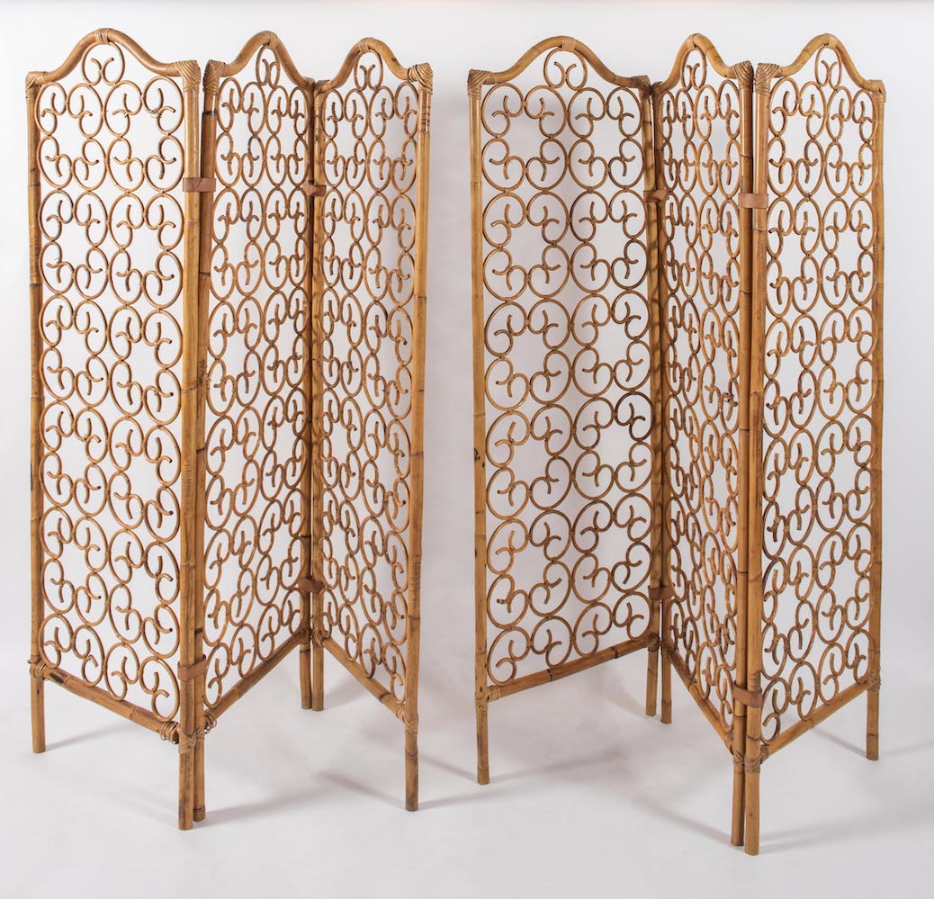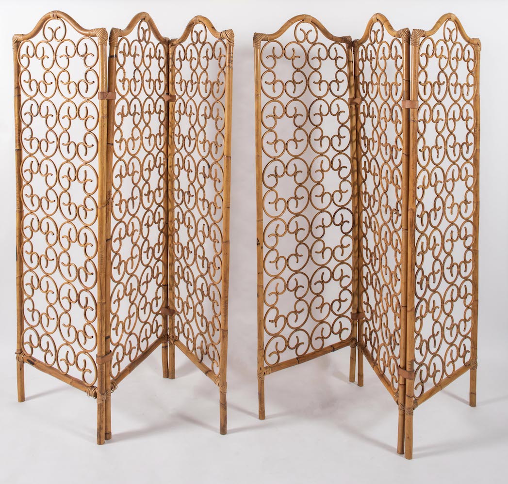 Coppia di paravento in bamboo e vimini con lacci in pelle. Prod. Italia, 1960...