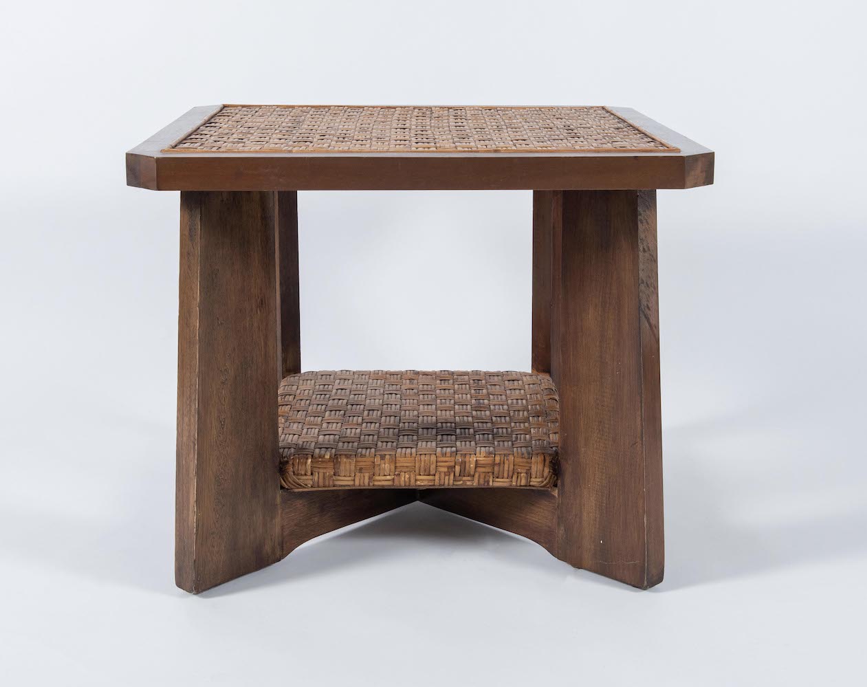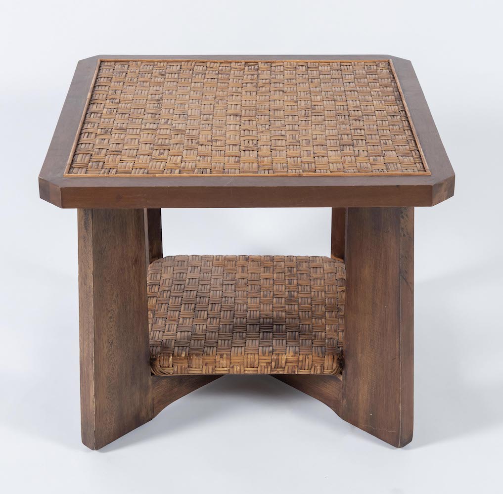 Tavolo in legno con inserti in midollino pressato. Prod. Italia, 1980 ca. Cm 70x70x56.