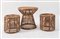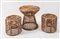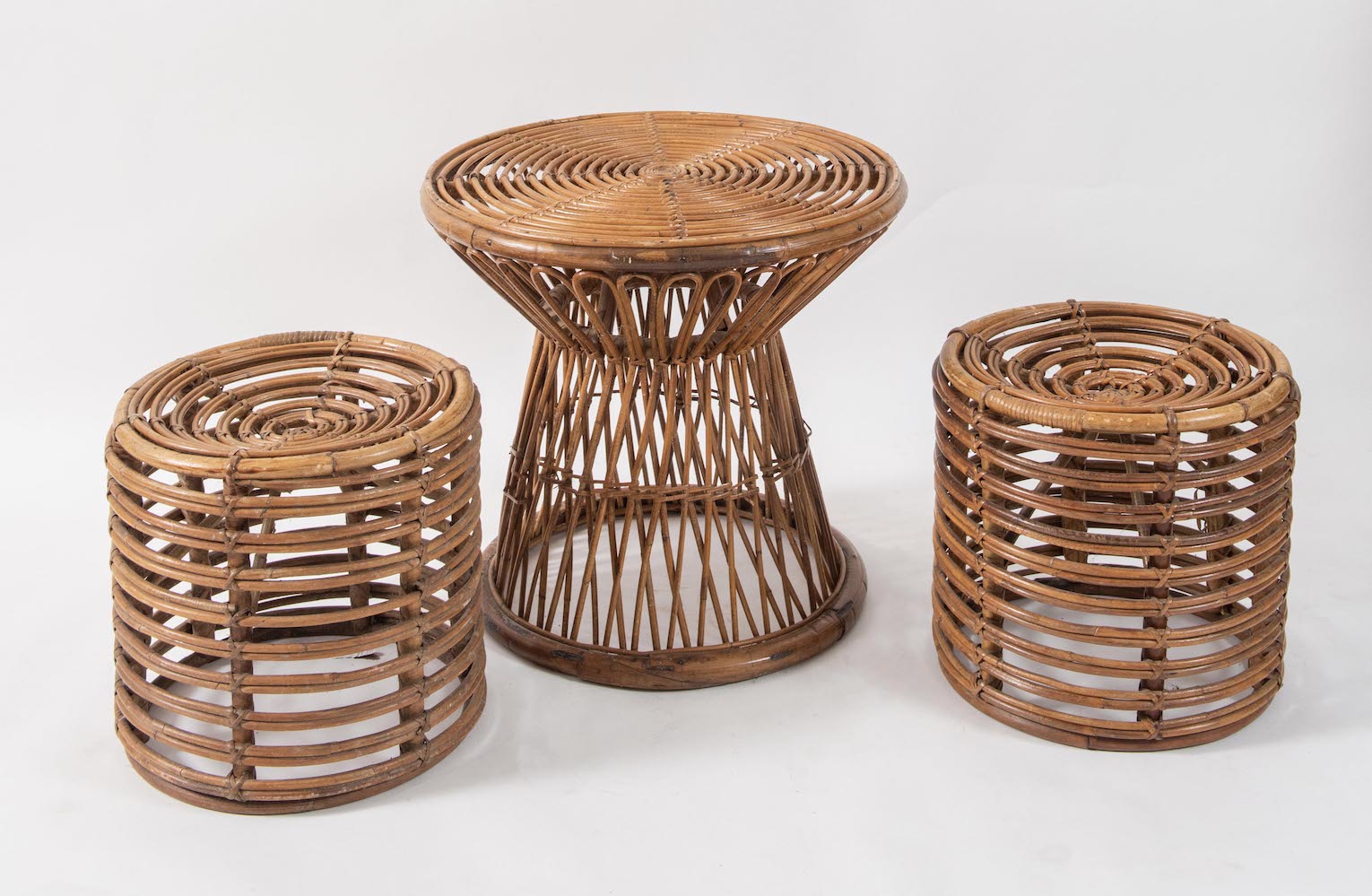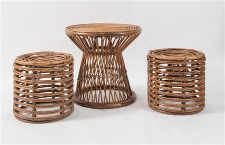 Set composto da tavolo e due sgabelli in bamboo. Prod. Italia, 1970 ca. Tavolo: cm 53,5x57x57, sgabello: cm 39x40x40.