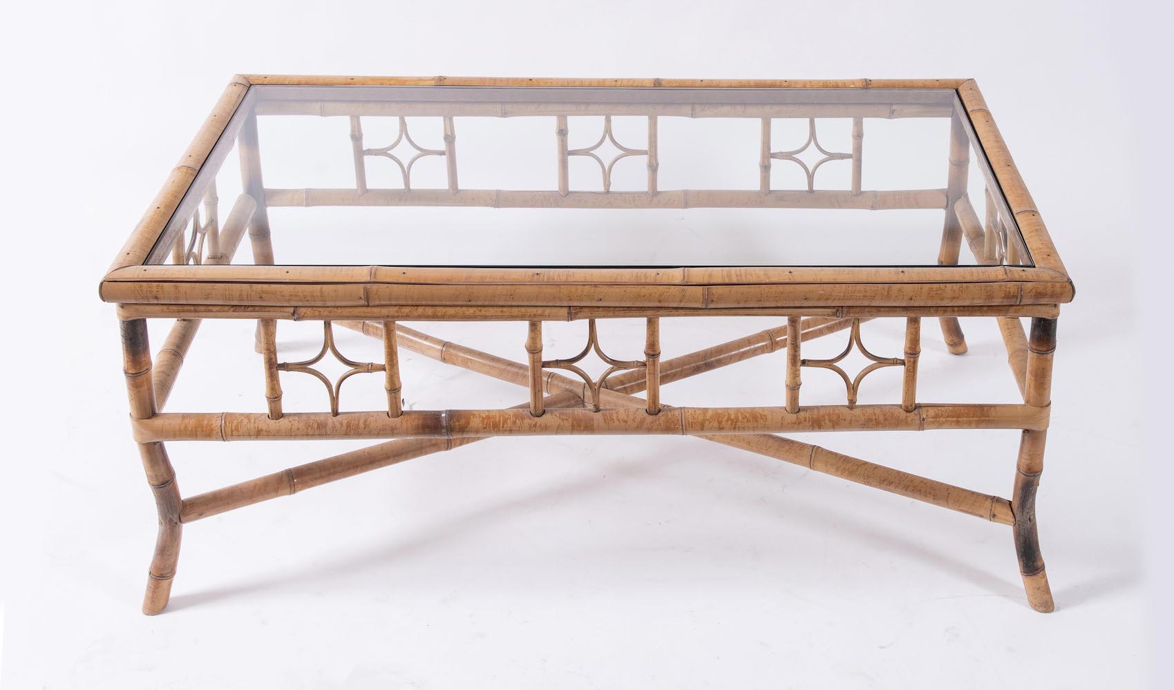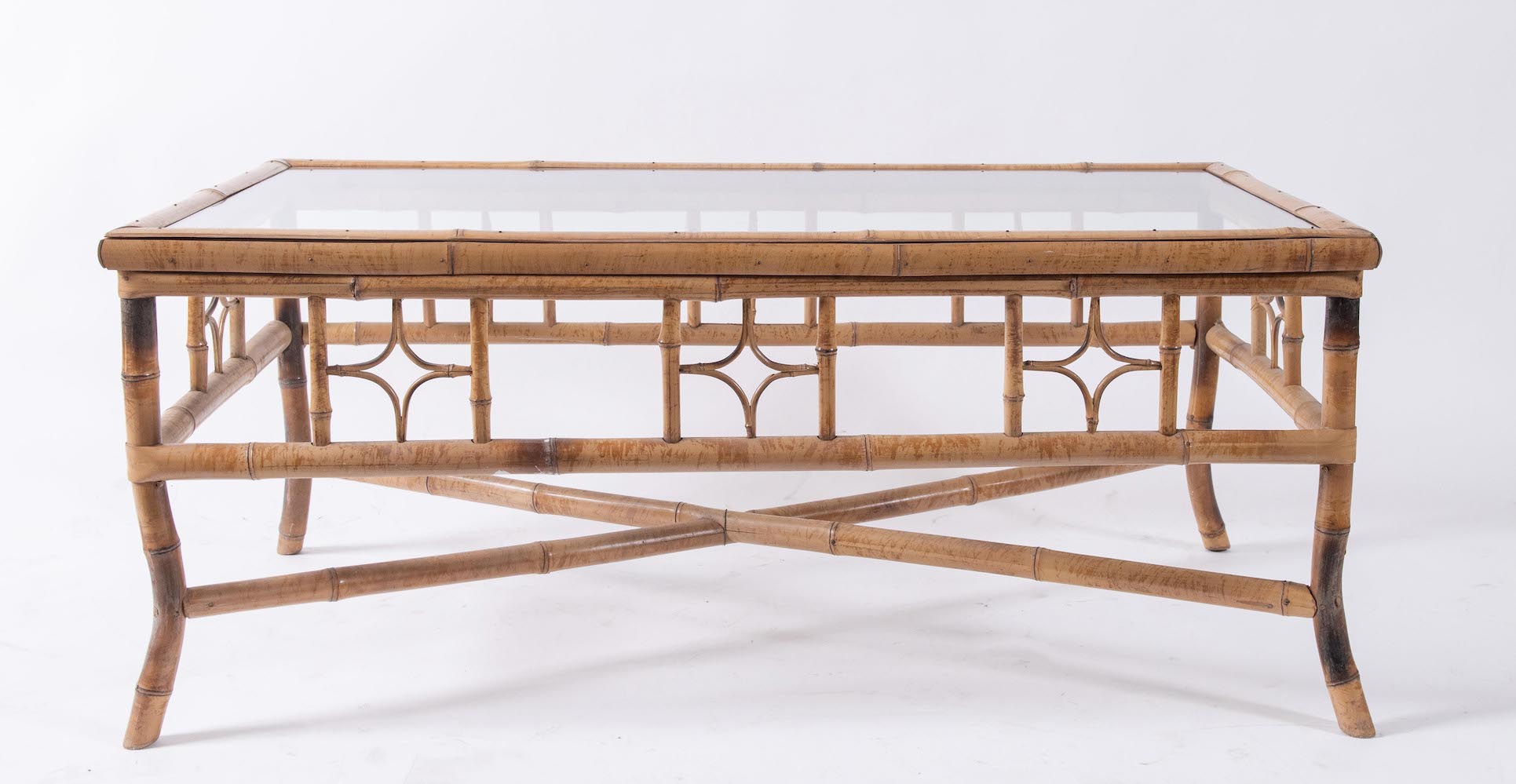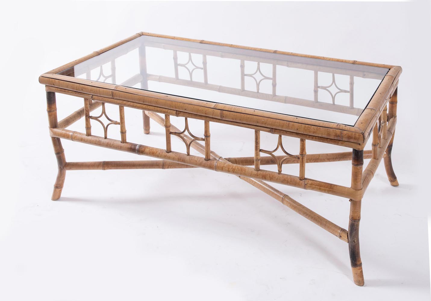 Tavolino da caffè in bamboo e canna d’india con piano in vetro. Prod. Italia,...