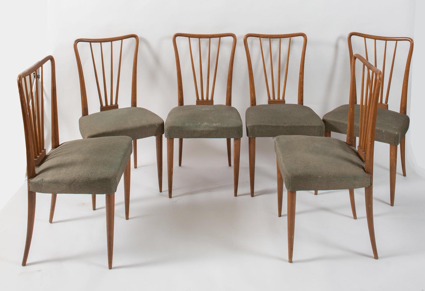 Sei sedie in legno rivestite in tessuto. Prod Italia, 1950 ca. Cadauna di cm...