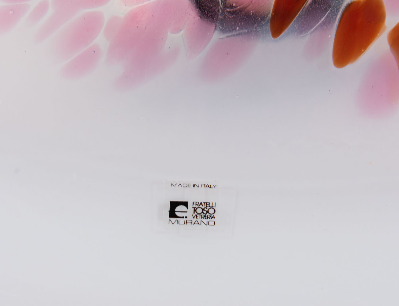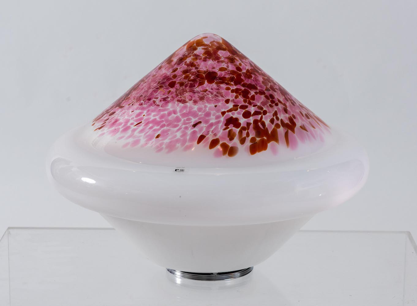 F.LLI TOSO Lampada da soffitto in vetro soffiato di Murano e con struttura in metallo. Marchio originale. Prod. F.lli Toso, Italia, 1970 ca. Cm 30x40x40.