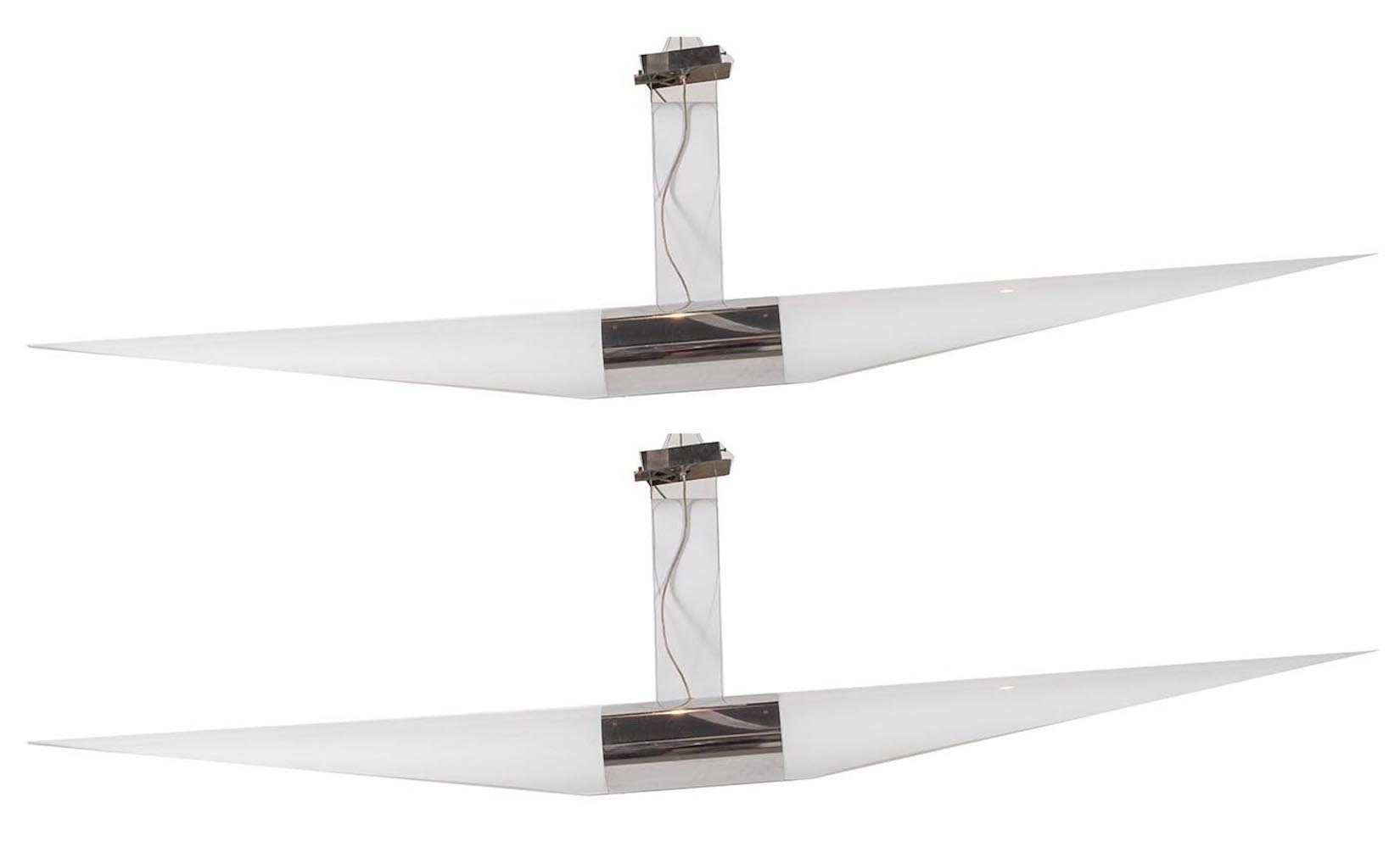 MARZIO RUSCONI CLERICI Coppia di lampade da soffitto in acciaio e plexiglas modello Shakti sky 200. Marchio originale. Presenta difetti. Prod. Kundalini, Italia, 2003. Cadauna di cm 200x180x20.