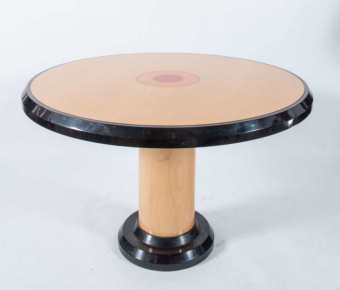 Lot 263 | Tavolo in legno massiccio con intarsi. Prod. Italia, 1980 ca. Cm 78x114x114.