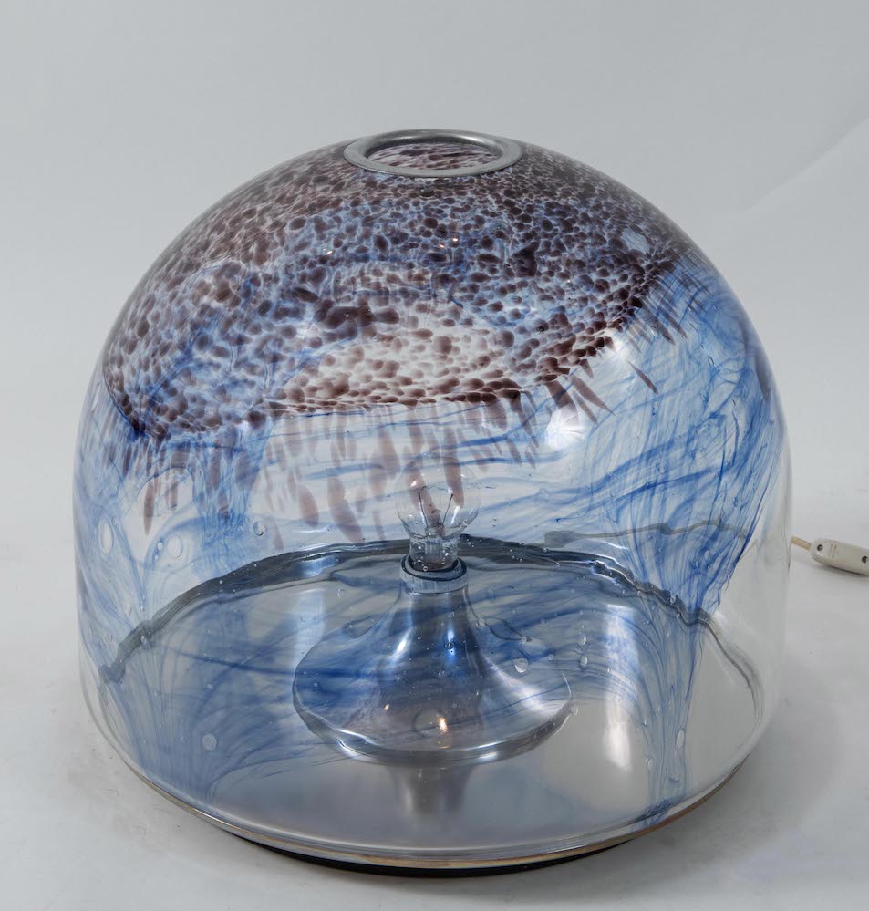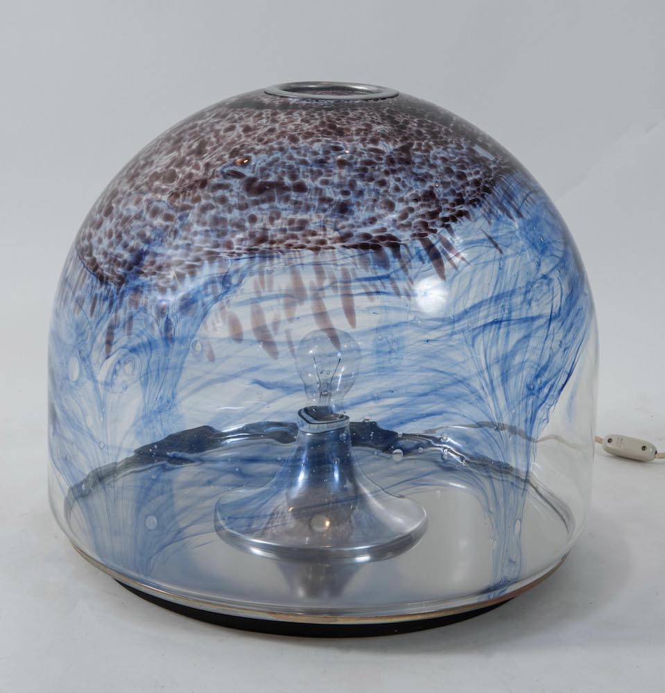 VISTOSI, attr. Lampada da tavolo in vetro con struttura in metallo. Prod. Italia, 1970 ca. Cm 42x48x48.