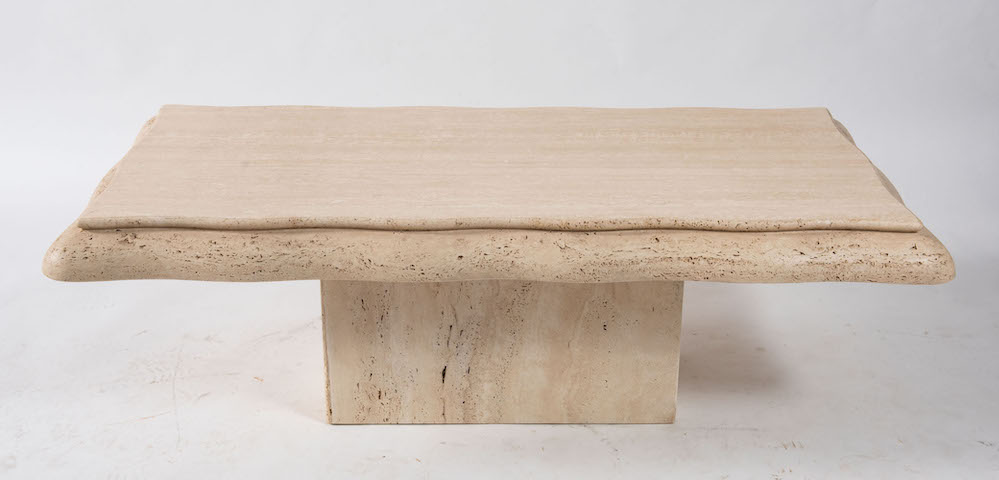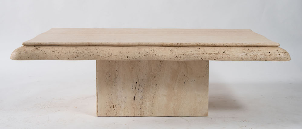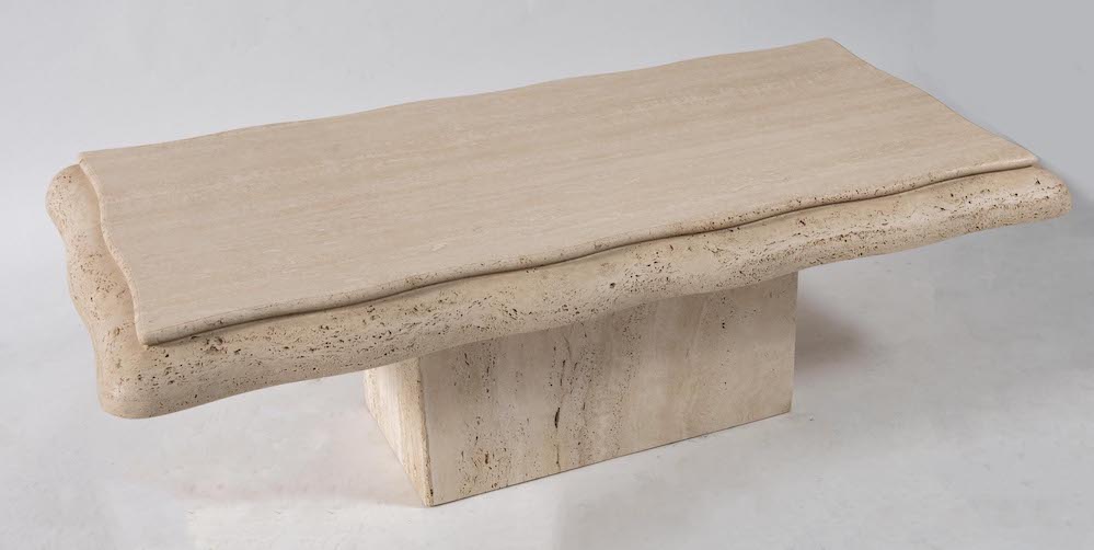 Tavolo da caffè in marmo travertino. Prod. Italia, 1970 ca. Cm 48,5x141x69.