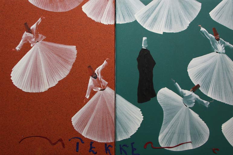 MONDINO Aldo (Torino 04/10/1938 - Torino 10/03/2005) Dervisci olio su linoleum cm. 80 X 120 Tecnica, titolo, firma 'Dittico, Dervisci, Mondino' (al retro) Autentica dell'artista su fotografia Bibliografia: A. Fiz, 'Aldo Mondino. Il viaggio', Poleschi Arte, Milano, 2002, pp. 42-43