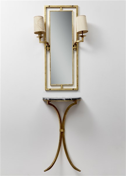 * Consolle con specchio e due appliques. Francia, anni '50. Ferro con applicazione di foglia d'oro, piano in marmo grigio venato e paralumi in tessuto beige. Firma incussa sotto la base della specchiera "R.THIBIER". (consolle cm 46,5x81,5x23; specchiera cm 40x100) (lievi difetti e restauri)