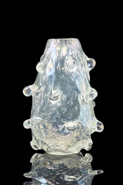 "Mugnoni" vase. Second half 20th century. Transparent colorless glass with inclusion of regularly arranged rhomboid bubbles. Strongly iridescent outer surface. (h 31 cm.)