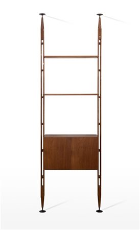Libreria a un modulo con uno stipo a due ante e due ripiani modello "LB7". Esecuzione Poggi, Pavia, 1956. Legno di teak massello, impiallacciato e bordato. (cm 90x284,5(montanti lignei)x35) (lievi difetti)