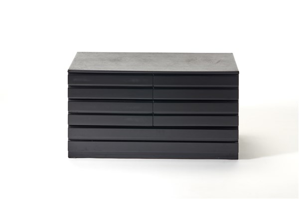 Cassettiera modello "CS49 Cassetti e contenitori Samarcanda". Esecuzione Poggi, Pavia, 1968. Medio denso laccato opaco nero, piano in pelle nera. (cm 107x56,5x53,5) (lievi difetti)