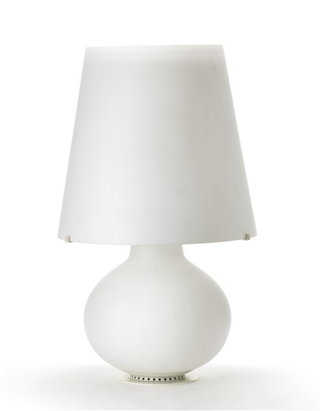 Lampada da tavolo modello "1853". Produzione Fontana Arte, Milano, 1954. Alluminio laccato bianco e vetro soffiato lattimo satinato. (h cm 78)
