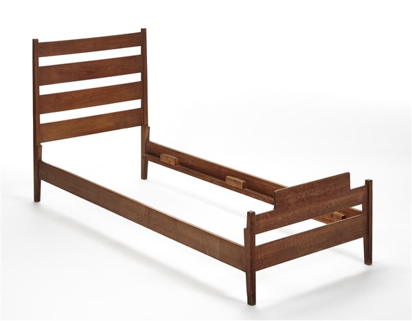 Letto singolo con testiera e pediera a doghe orizzontali, montanti a sezione quadrata e rettangolare digradante. Milano, 1947. Legno massello di noce. Letto facente parte dell'arredo tipo originale realizzato per gli appartamenti per la casa costruita nel quartiere modello QT8, per VIII Triennale di Milano. (cm 85,5x101,5x186) (difetti)