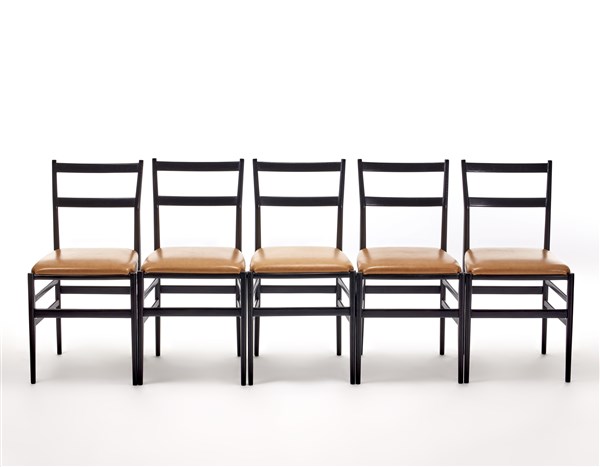 Lotto di cinque sedie modello "646 Leggera". Produzione Cassina, Meda, anni '50. Legno massello tinto nero e seduta imbottita e rivestita in vinilpelle. (cm 42,5x83x46) (lievi difetti e restauri)